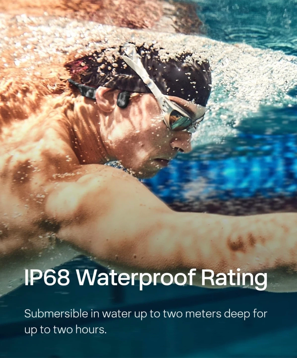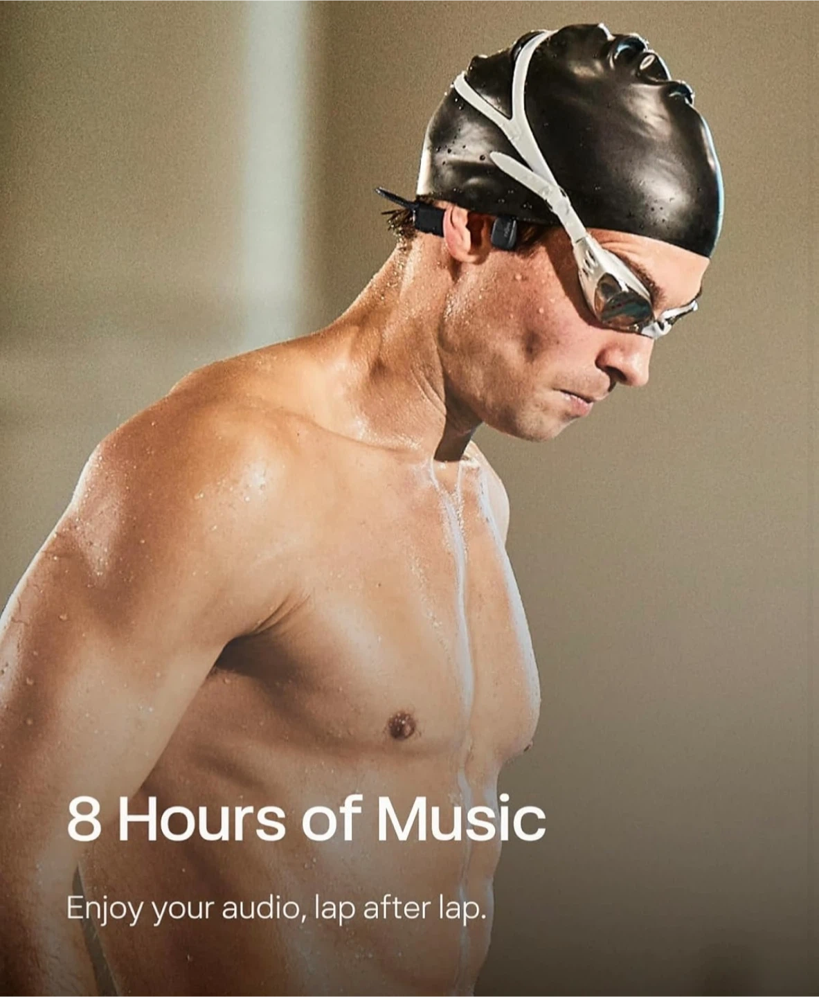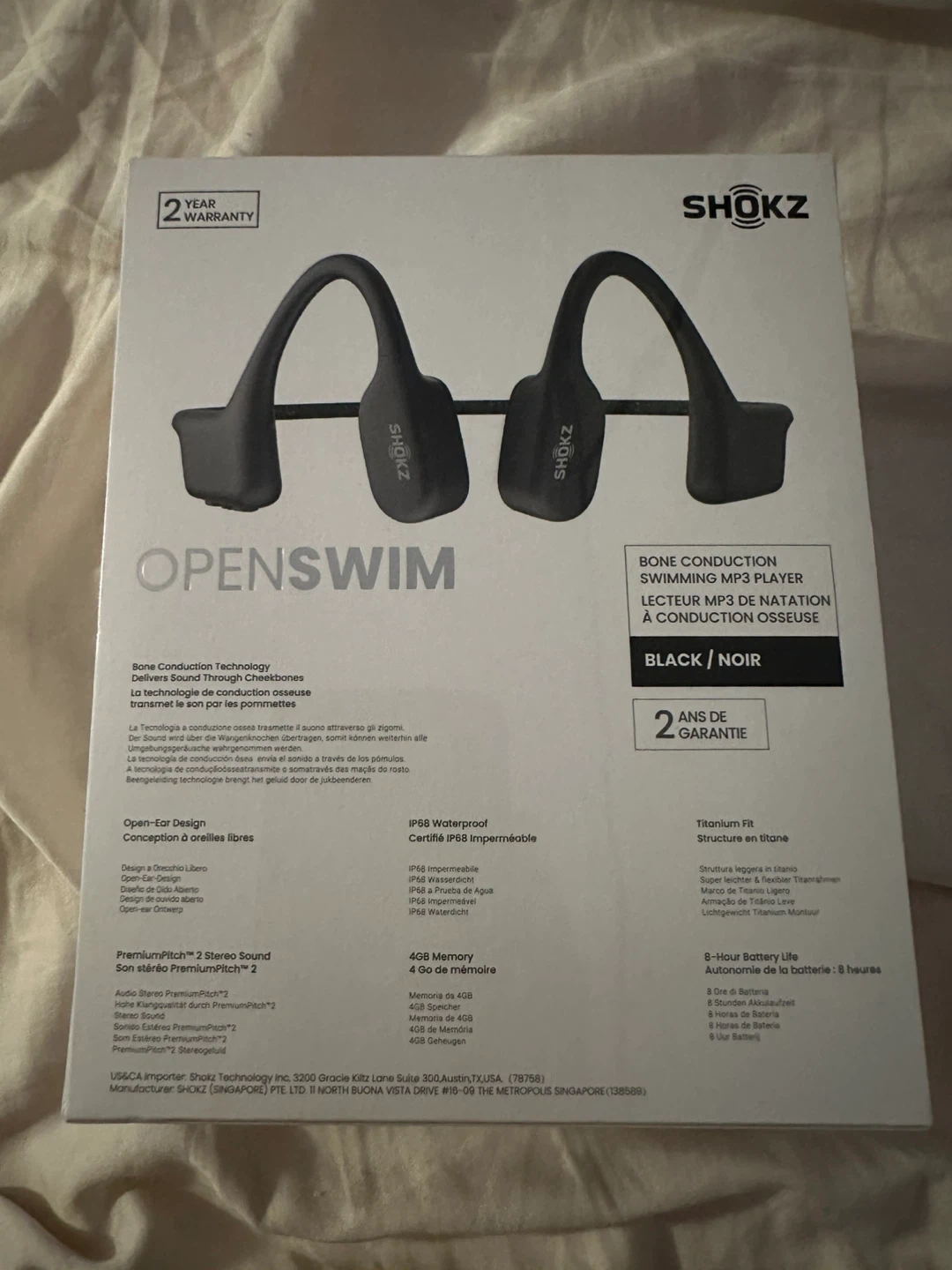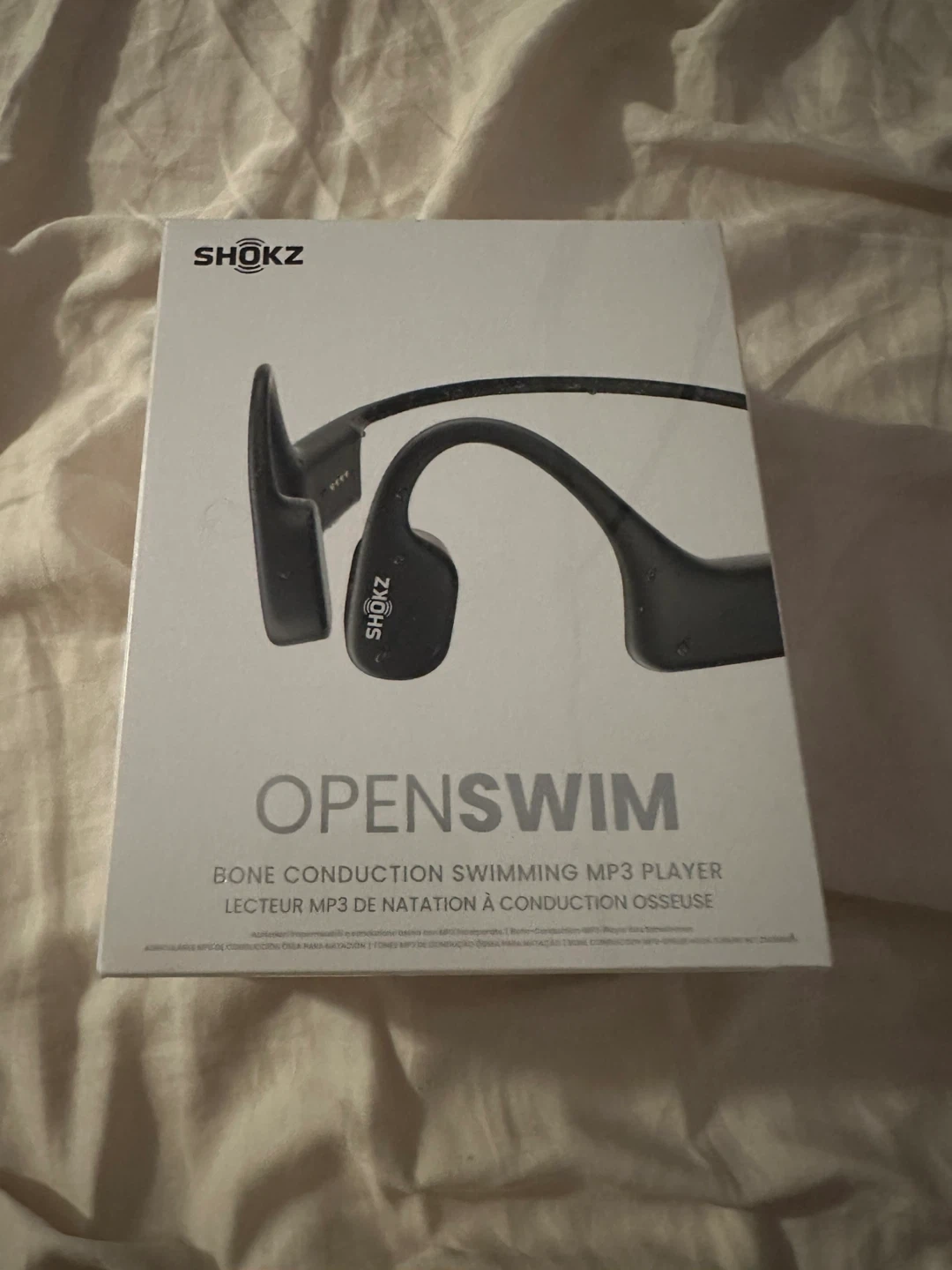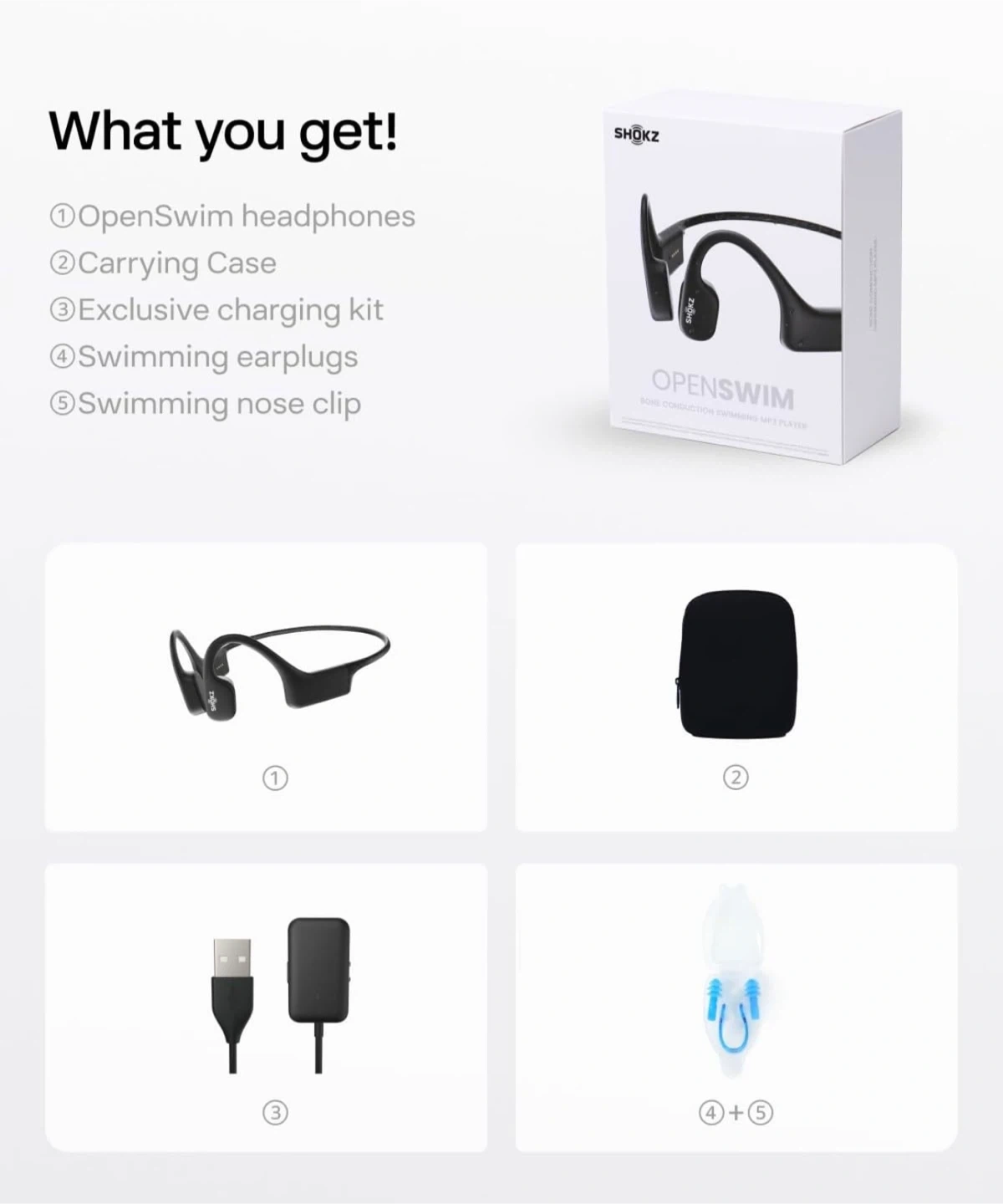 315Get ready to swim with these Shokz OpenSwim bone conduction headphones! These are perfect for listening to music while swimming. Included: - OpenSwim headphones - Carrying case - Exclusive charging kit - Swimming earplugs - Swimming nose clip They feature excellent underwater sound quality, powered by 7th generation bone conduction technology