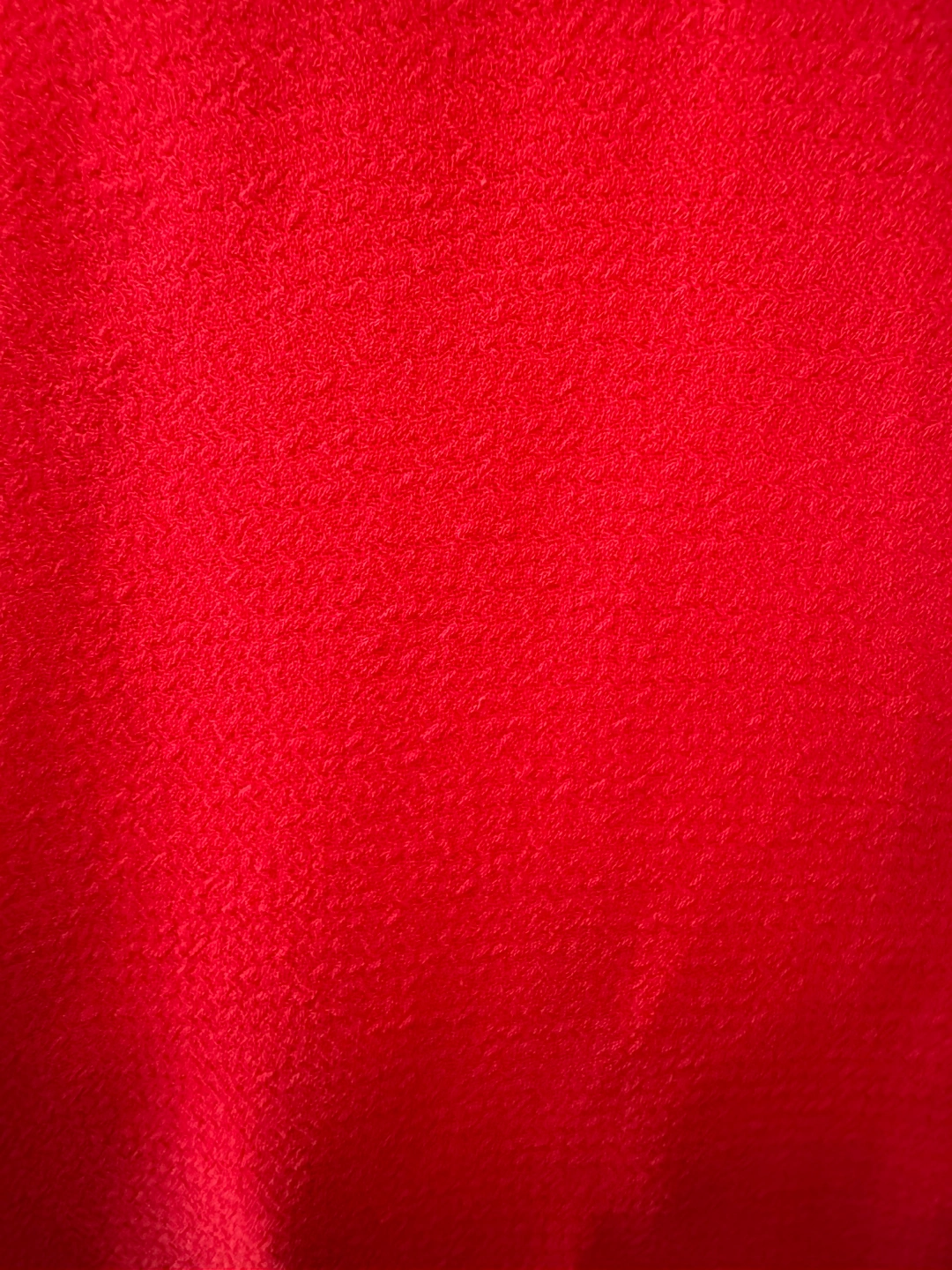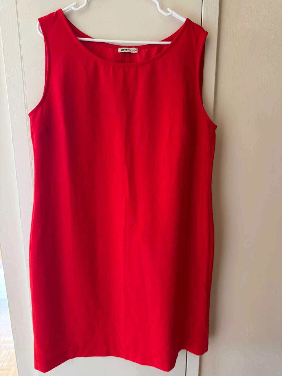 166A vibrant red dress, size 48 It's in great condition and ready for a new home. The material has a subtle texture that adds a nice touch to the simple design.
