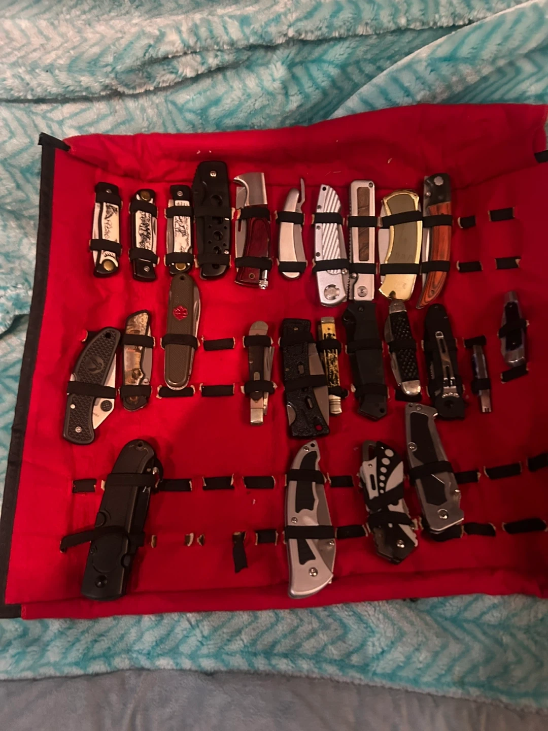Collection of various pocket knives. Assortment includes different styles and sizes. Includes a red roll-up carrying case.
