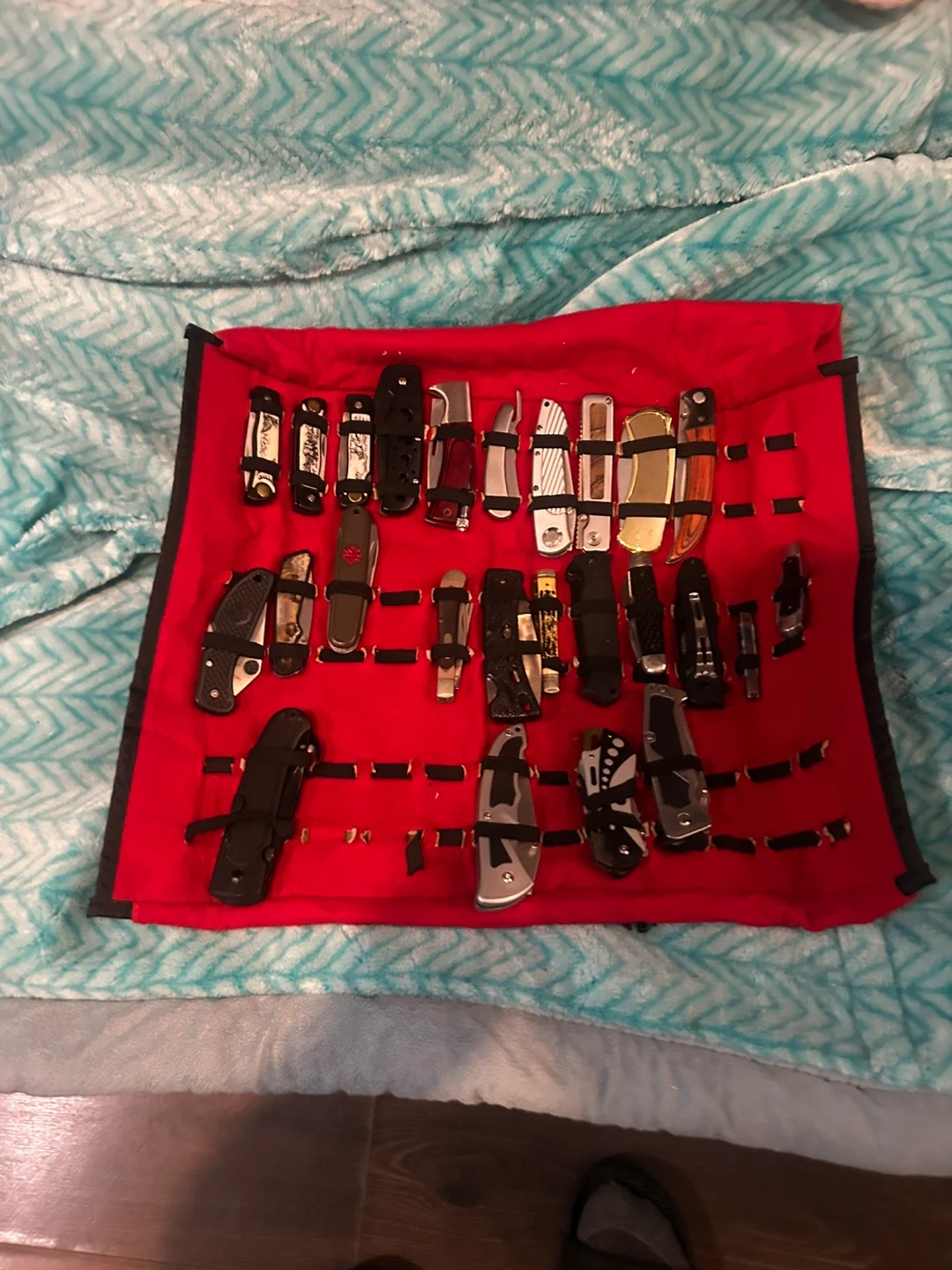 Collection of various pocket knives. Assortment includes different styles and sizes. Includes a red roll-up carrying case.