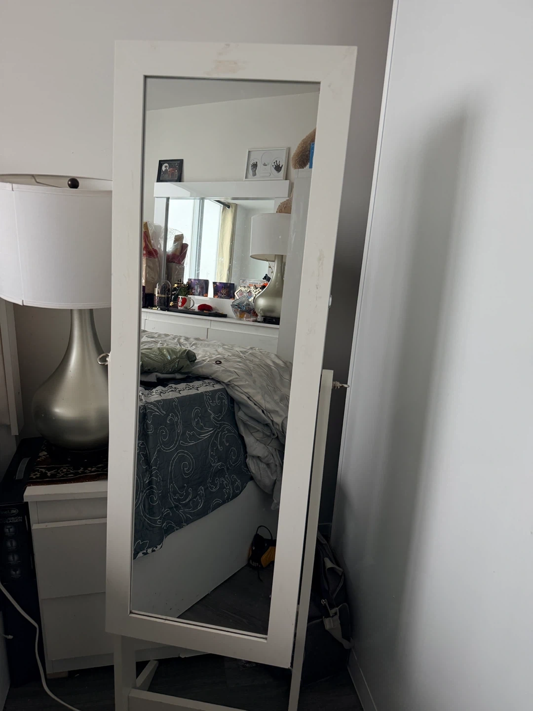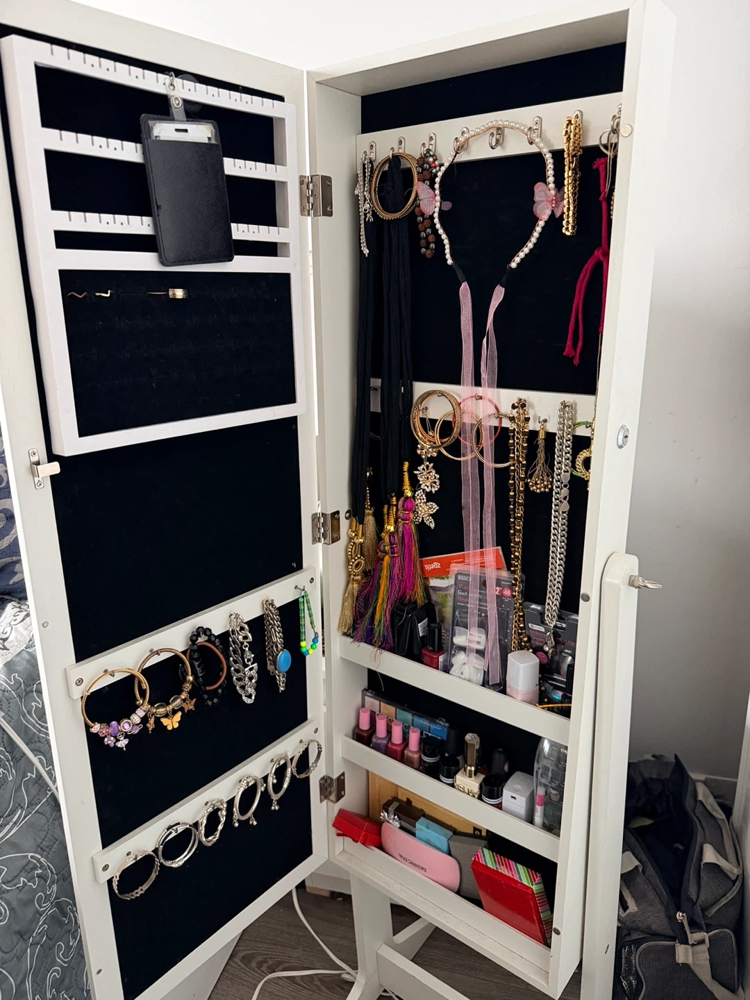 Selling a white jewellery armoire with a full-length mirror. It's perfect for organizing all your accessories and has plenty of space for necklaces, earrings, and makeup. Great for any bedroom or dressing area!