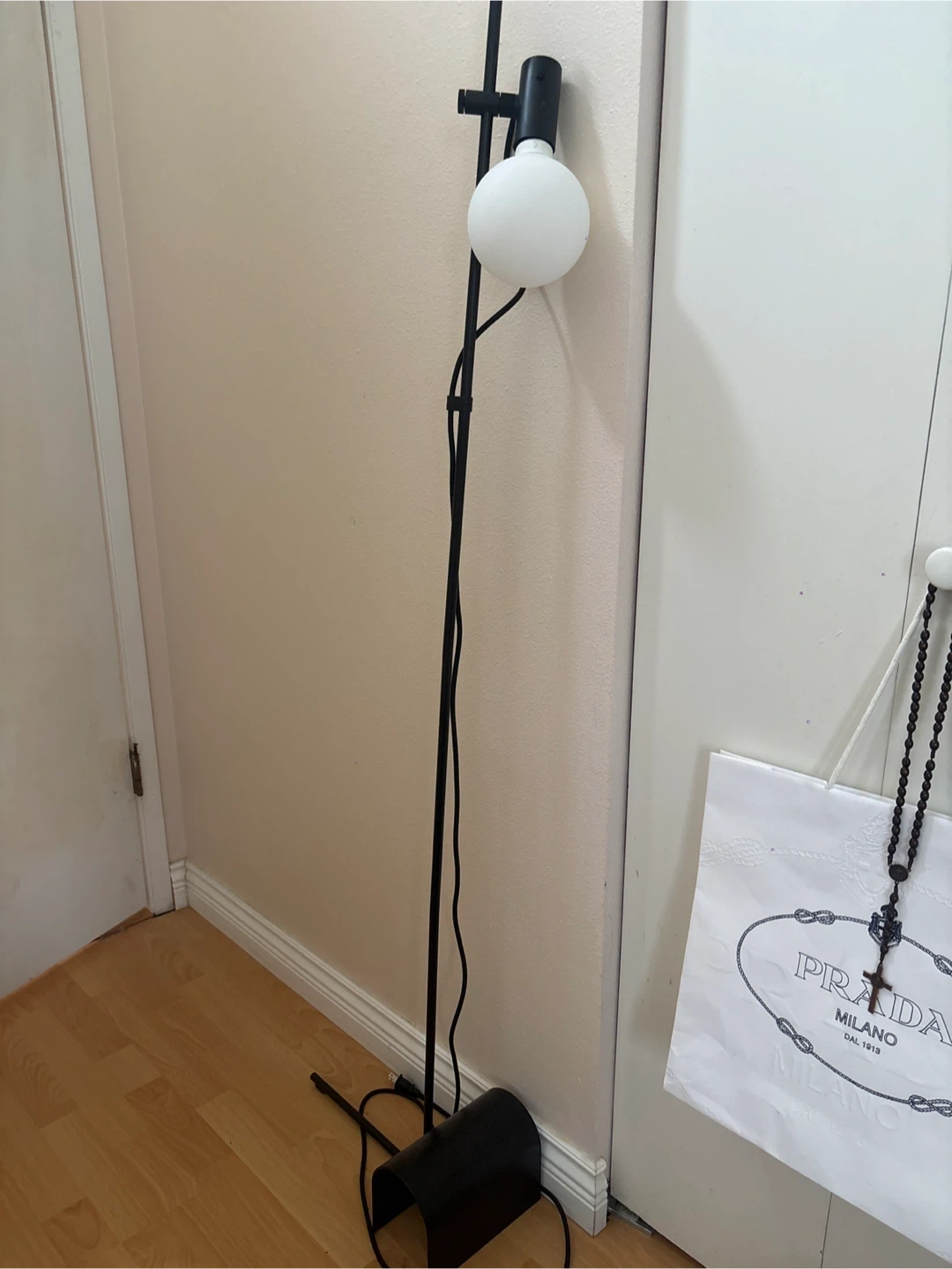 A modern black floor lamp featuring a frosted globe shade. It's a simple yet stylish lighting solution for any room. The lamp has a flexible neck for directional lighting. Black metal construction.