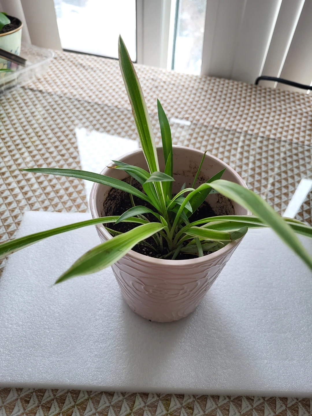 A healthy spider plant with striped leaves, potted in a textured pink ceramic pot. It's a lovely houseplant that's easy to care for. These plants are known for their air-purifying qualities.