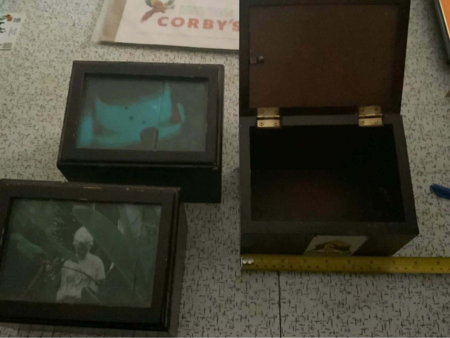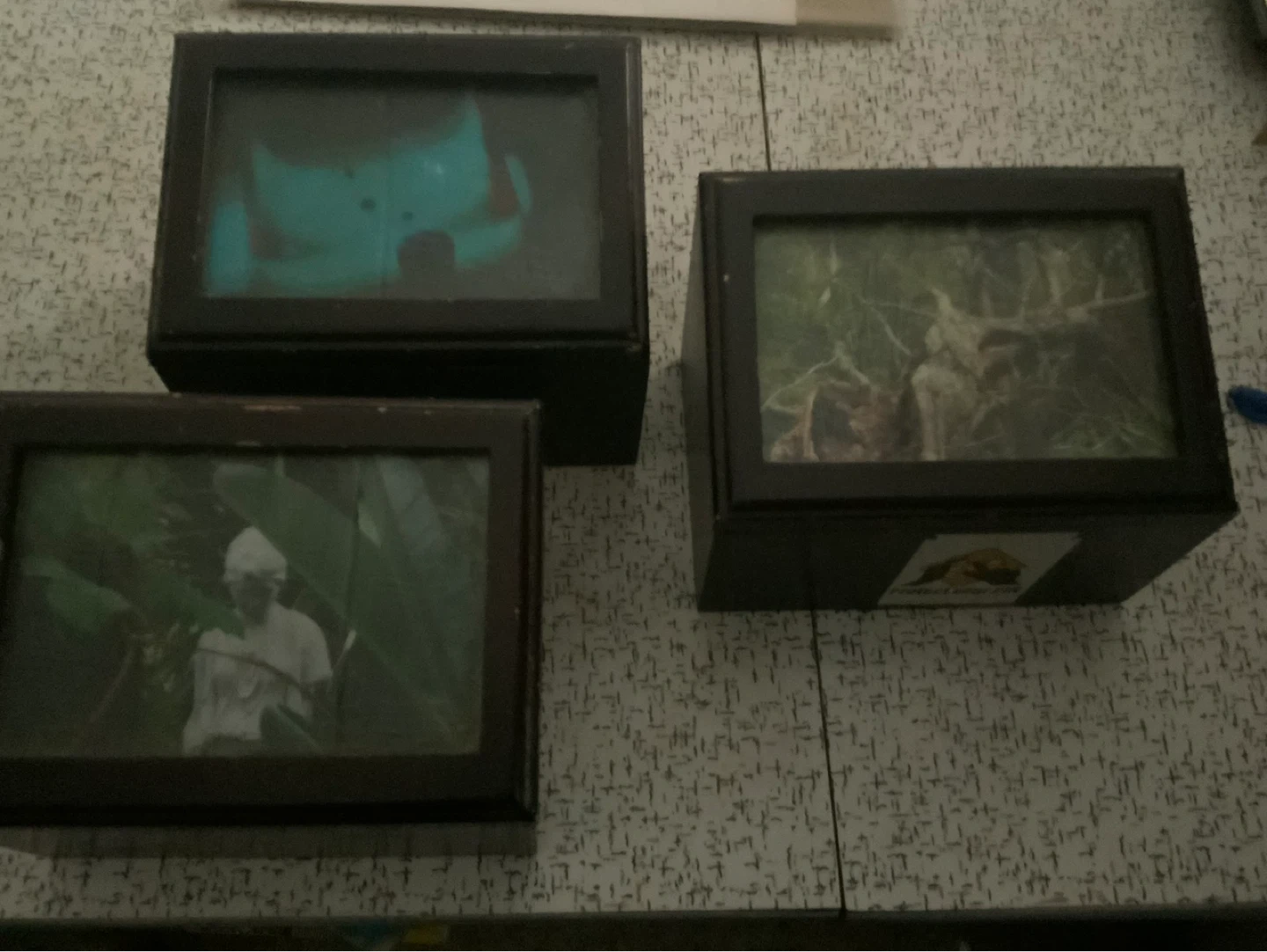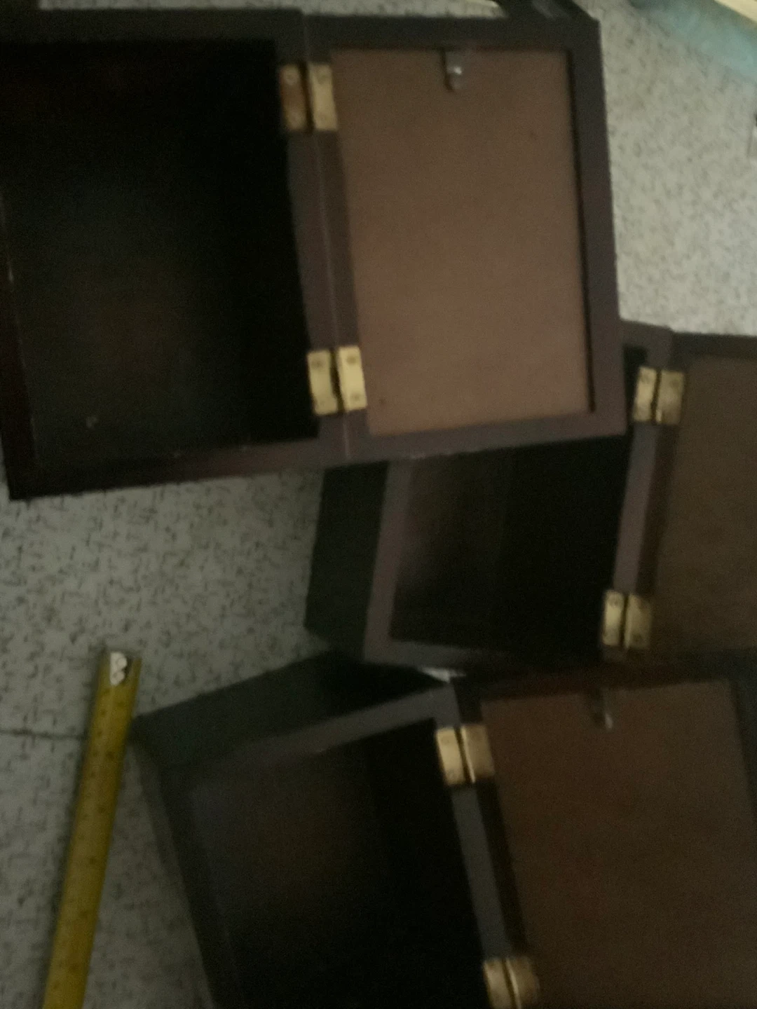 Three wooden keepsake boxes, each with a front-facing photo frame. The boxes have brass hinges and latches. Perfect for displaying small treasures or memories!