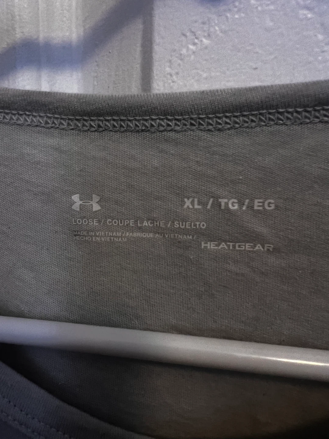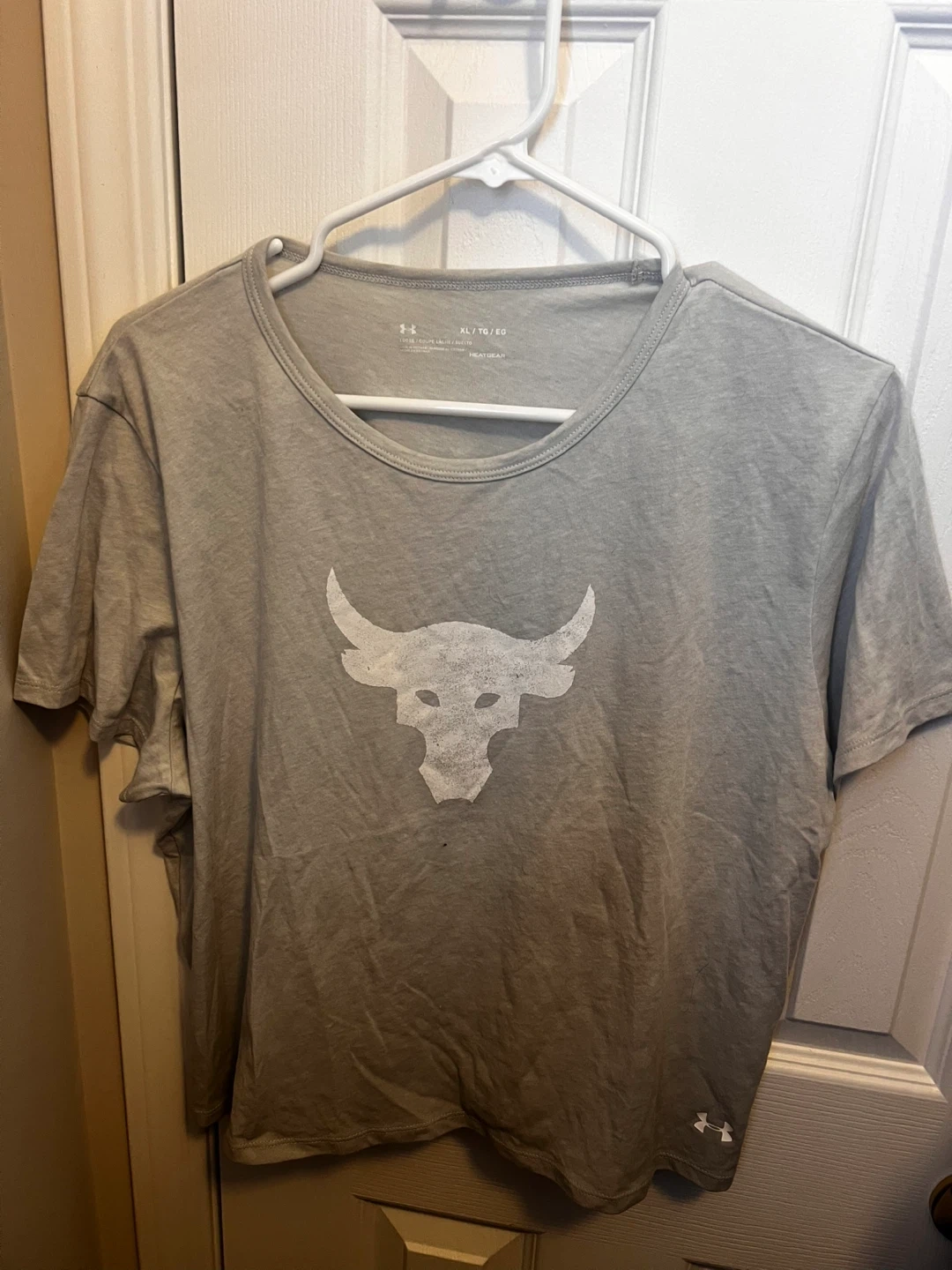 Grey Under Armour t-shirt with Project Rock bull graphic. Size XL. HeatGear fabric. Made in Vietnam.