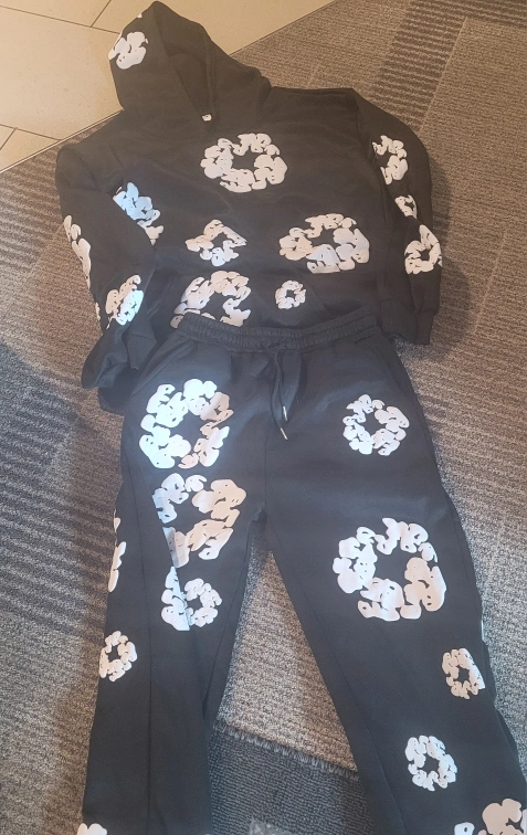 Selling a Denim Tears black hoodie and sweatpants set. The hoodie and sweatpants feature the cotton wreath design all over. The material is cotton. Have 2 pairs.