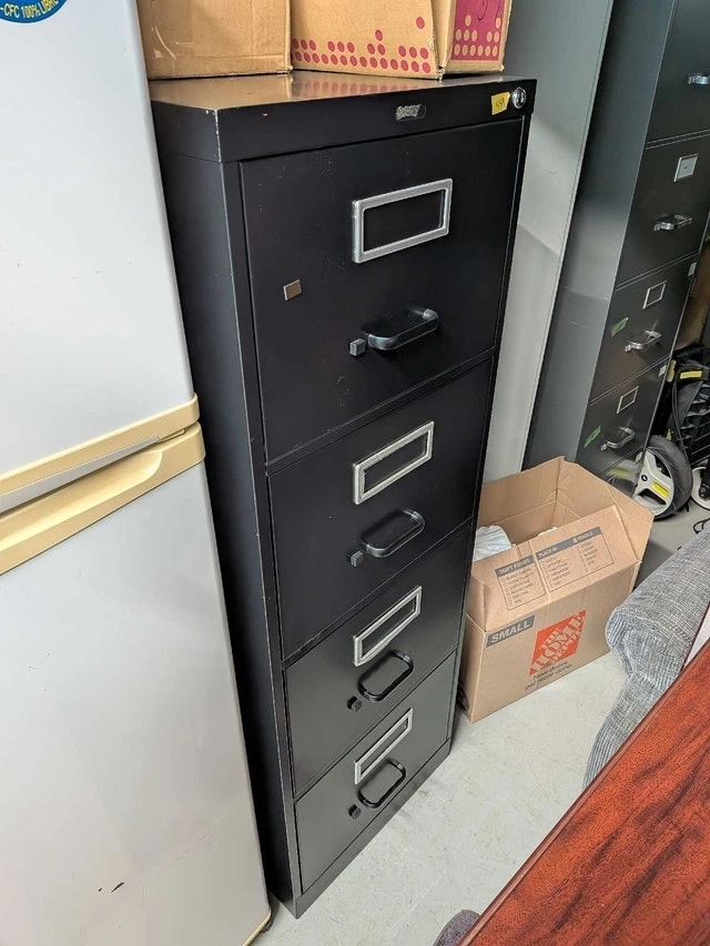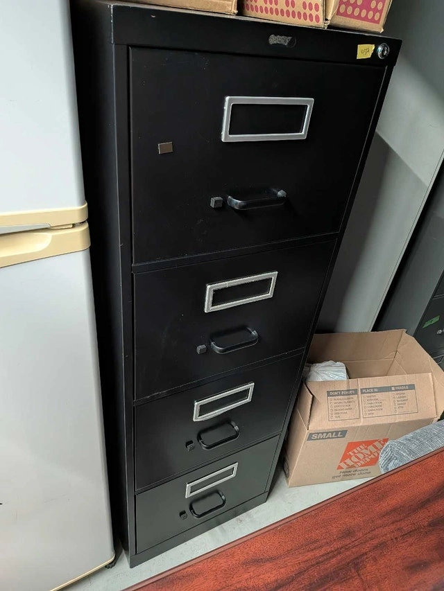 Used - Like new. 4-drawer vertical steel filing cabinet, legal-sized, black, Staples brand. Frames included for drawers and some hanging files.