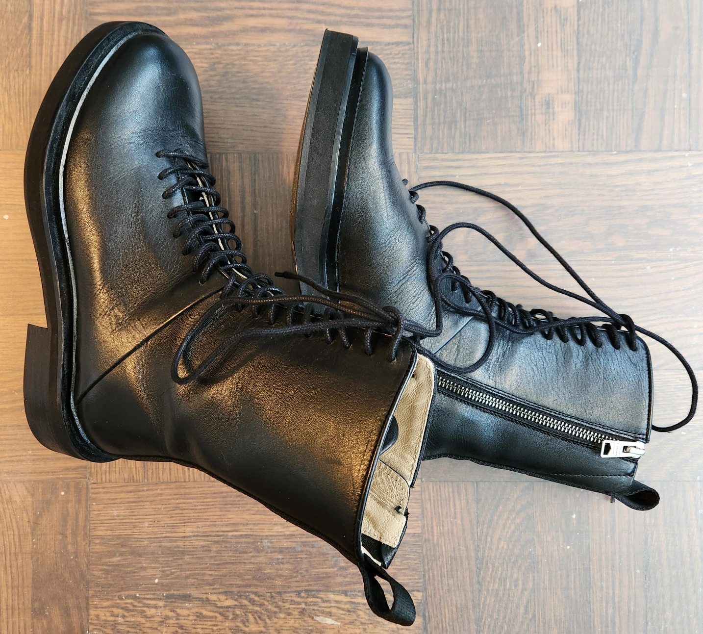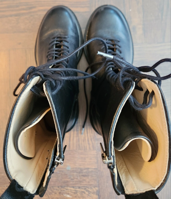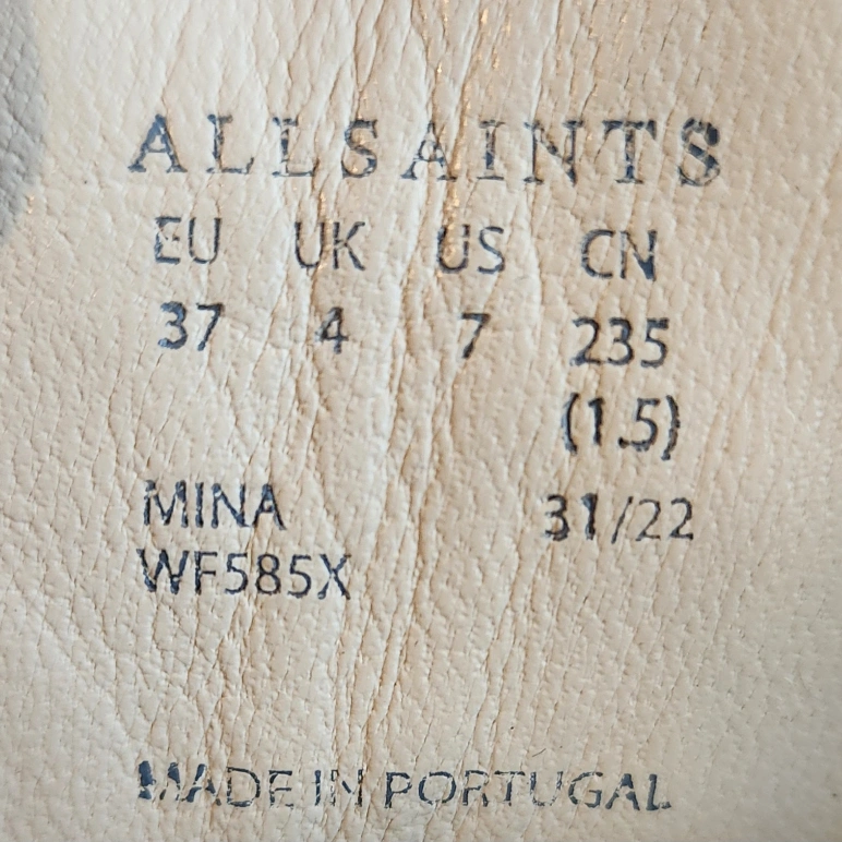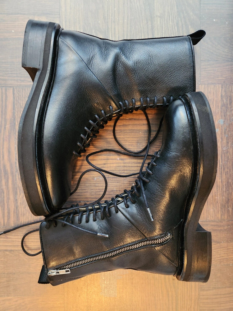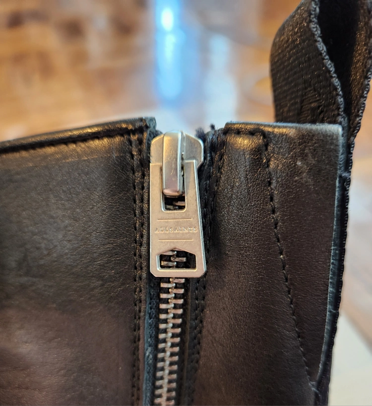 Selling a pair of AllSaints Mina boots in black leather. These are a US size 7 / EU 37. The model number is WF585X. Made in Portugal. Originally bought for $449.00. Worn once. Left zipper professionally replaced as shown.