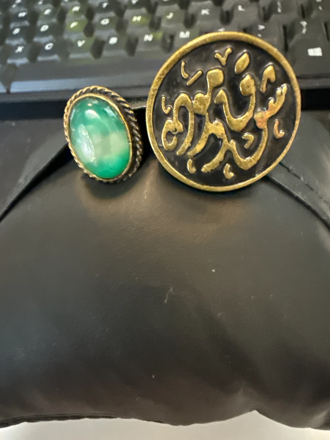 This set includes two unique rings. One ring has a green stone accent, and the other features ornate gold-toned Arabic script on a black background. They're decorative pieces.