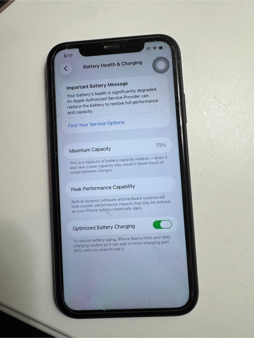 Apple iPhone 11 in black with 128GB storage. Battery health is at 73% maximum capacity.