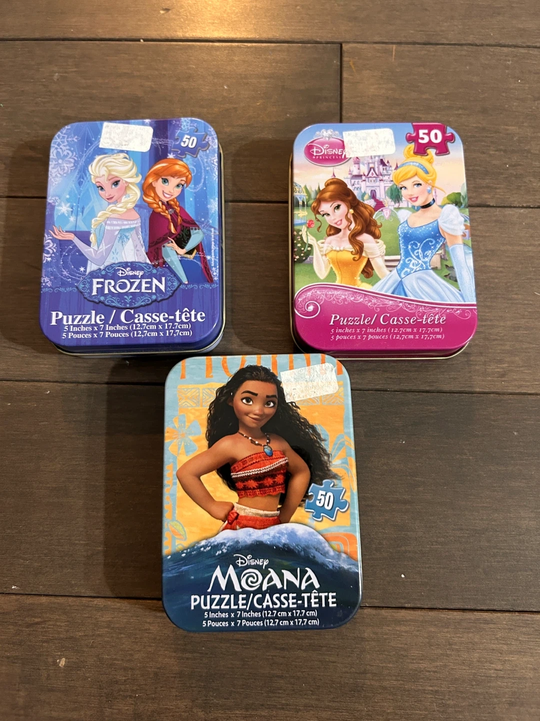 Price is for all. Selling a 3-pack of Disney themed puzzles. Includes Frozen, Moana, and Princesses. Each puzzle measures 5 inches x 7 inches. Great fun for kids!