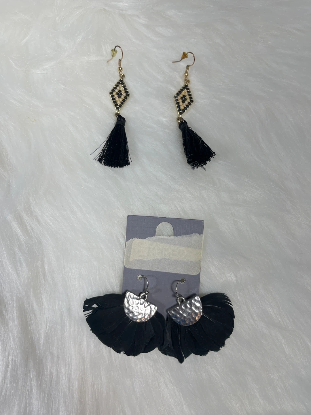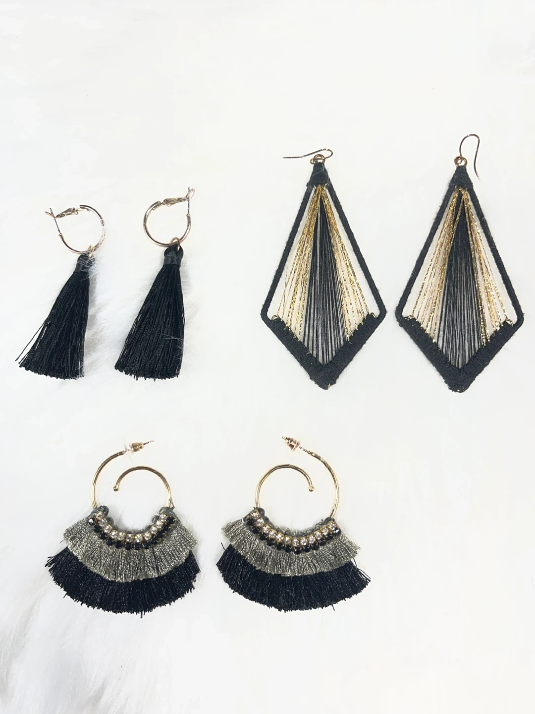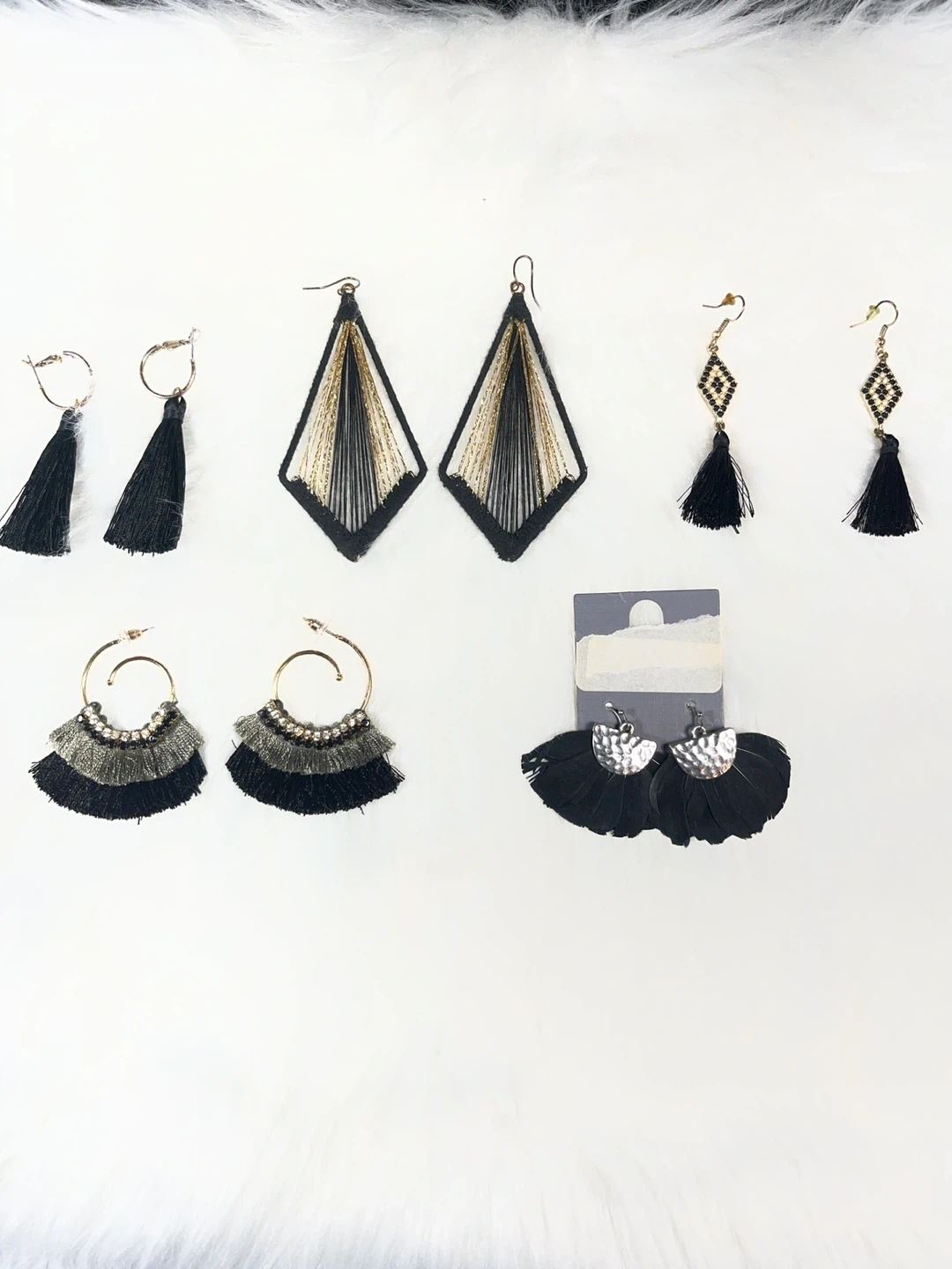 This set includes five pairs of earrings, featuring various tassel and geometric designs. All earrings are black with some metallic accents. (ALL FOR $12 )