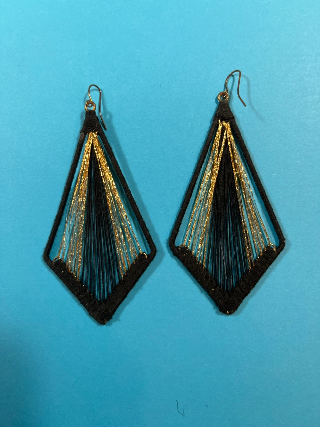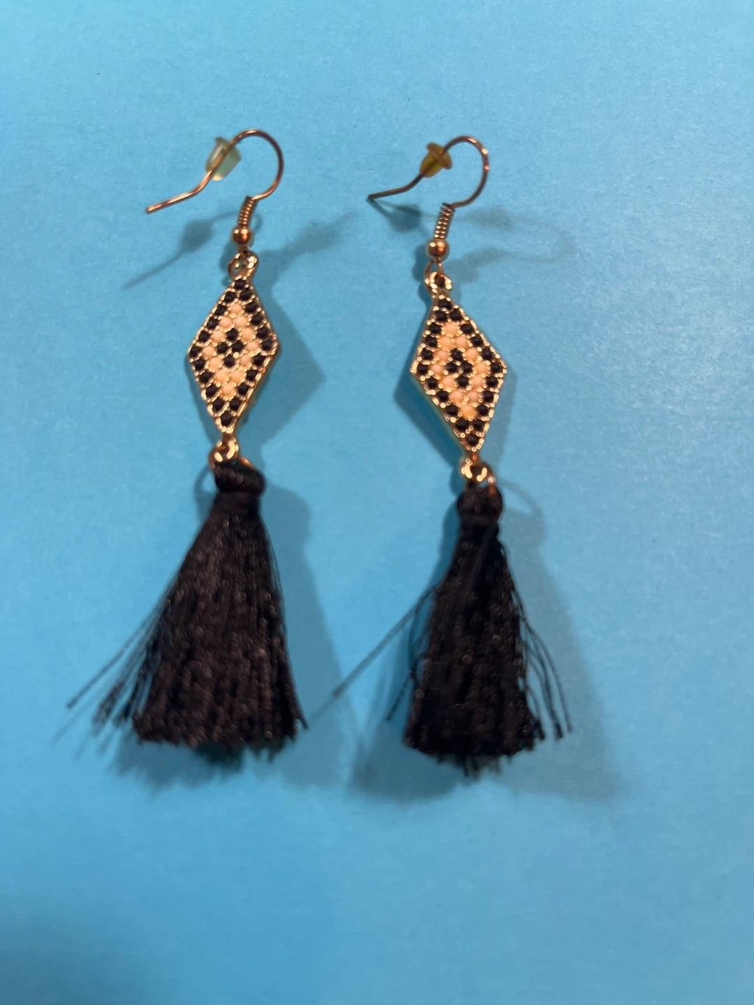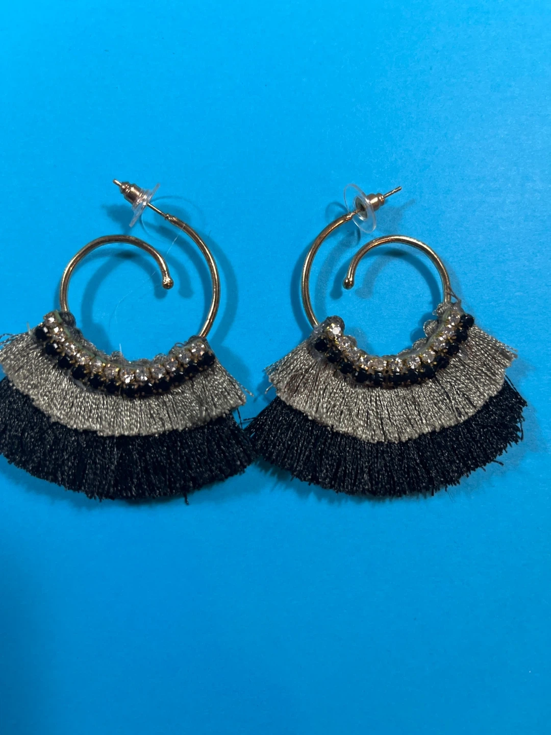 This set includes five pairs of earrings, featuring various tassel and geometric designs. All earrings are black with some metallic accents. (ALL FOR $12 )