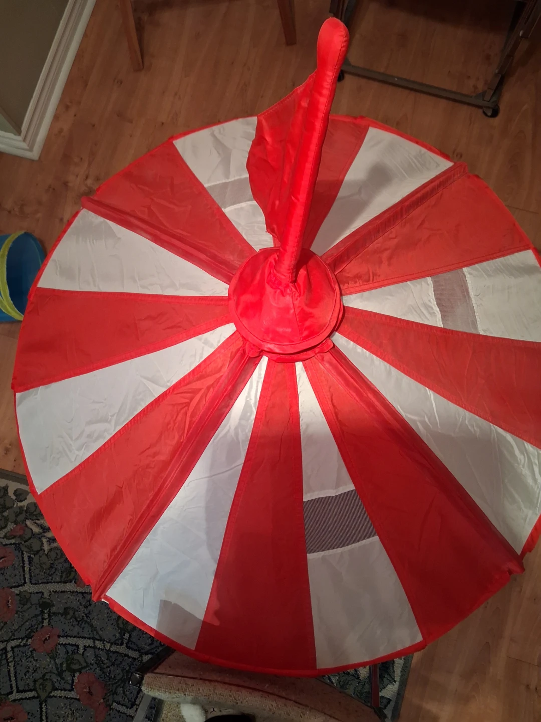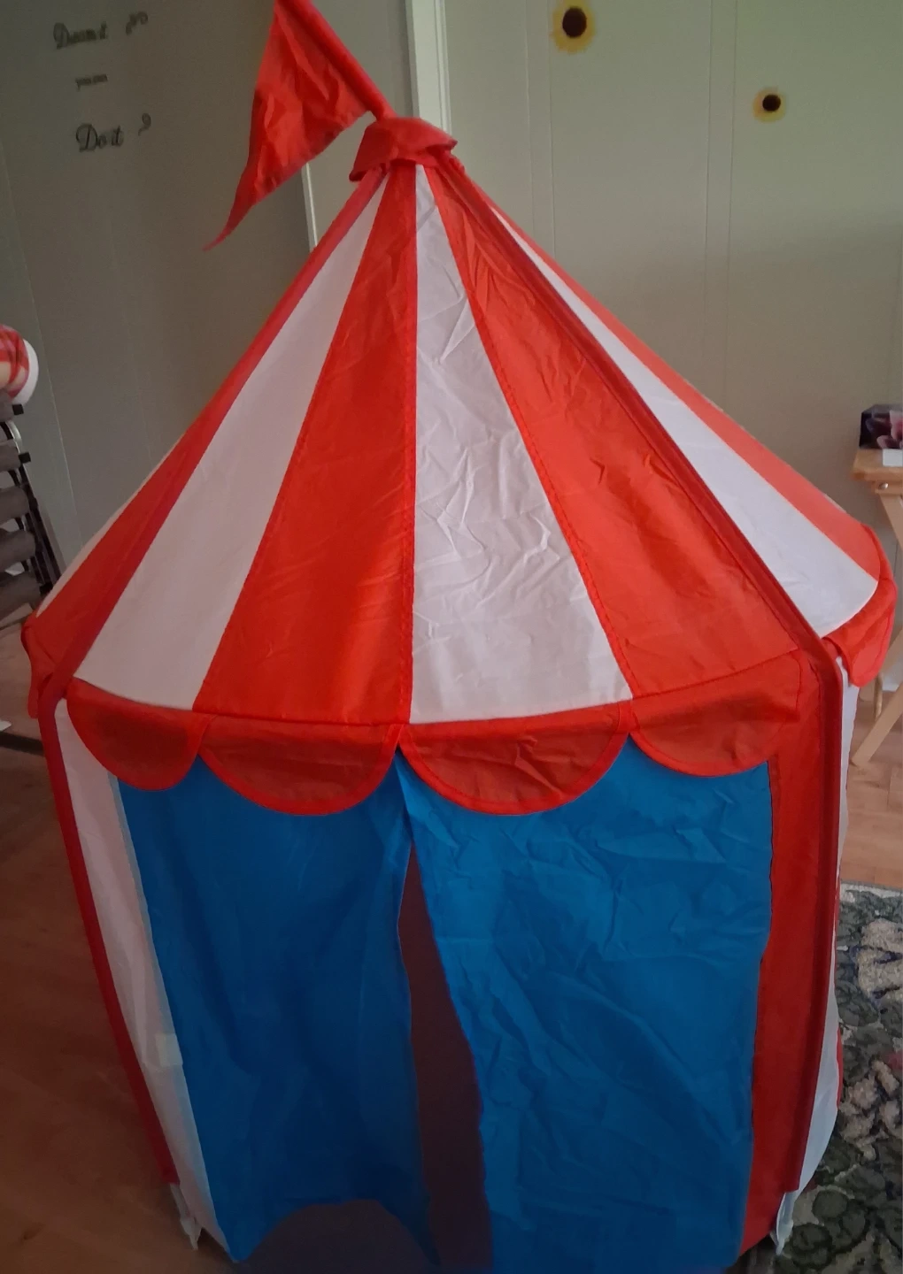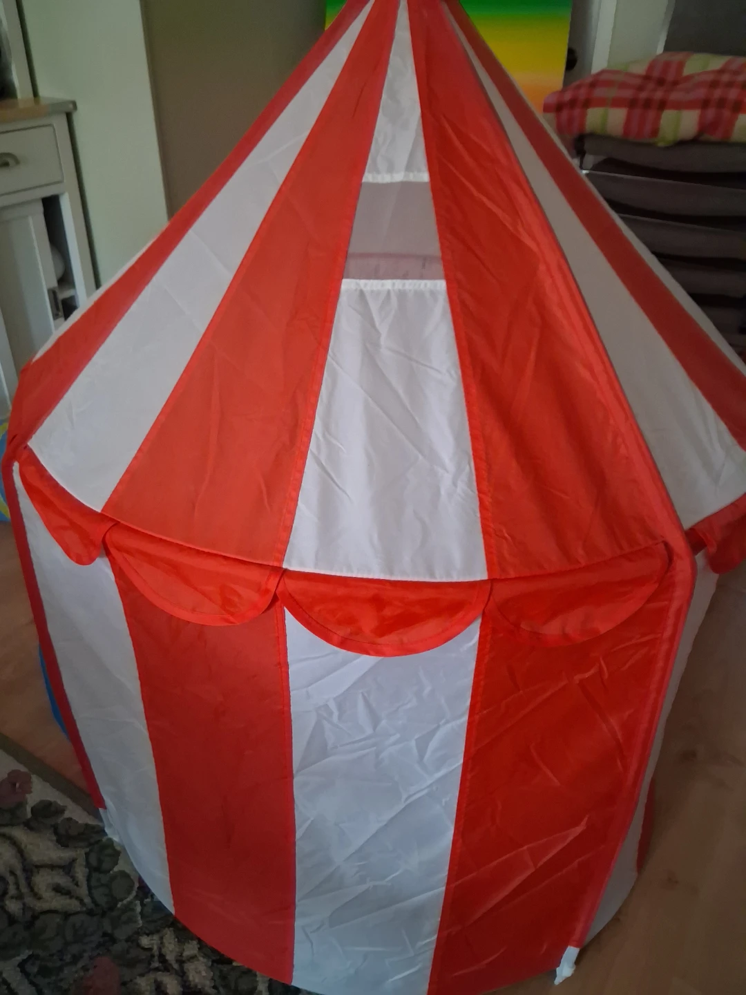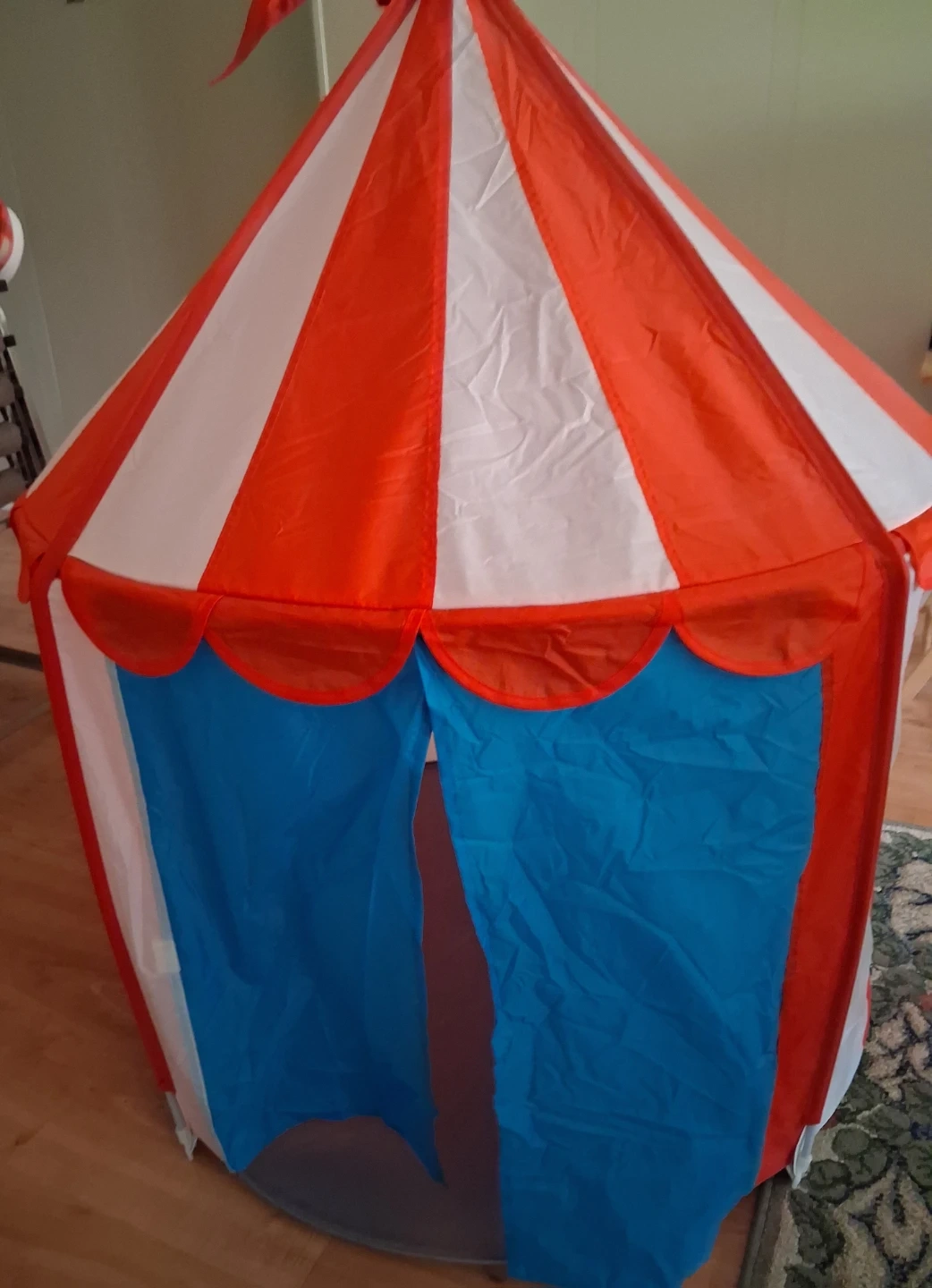 This fun circus-themed play tent made of nylon material is perfect for kids. It features a vibrant red and white striped design with blue curtains at the entrance. It's a great space for imaginative play! It is 3ft across.