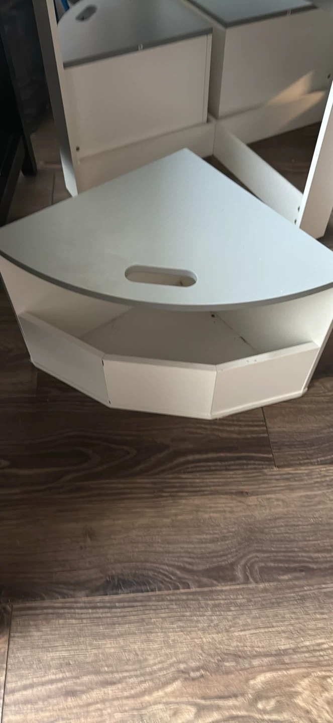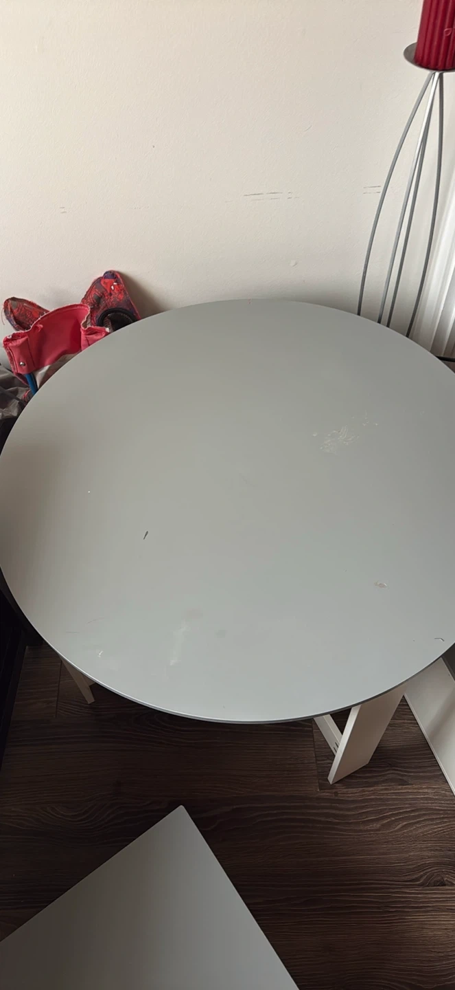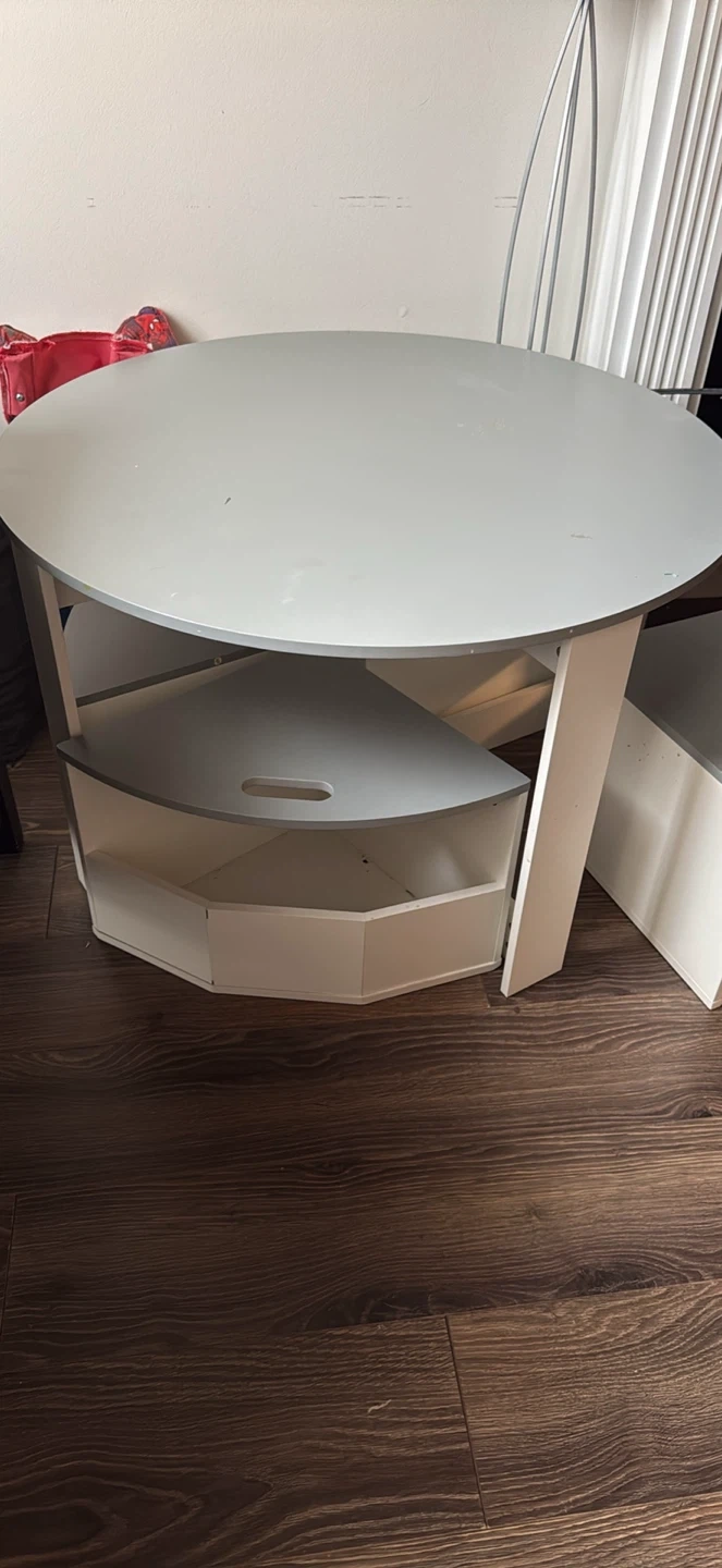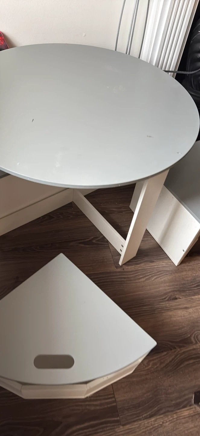 Round grey activity table designed for children. Comes with 4 triangular storage benches that fit snugly underneath. Perfect for playrooms or nurseries!