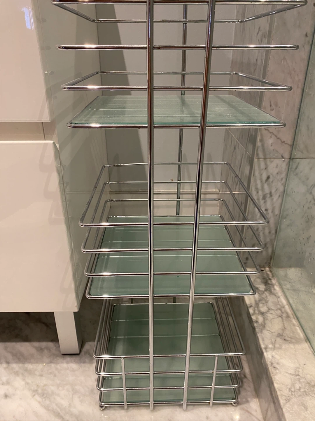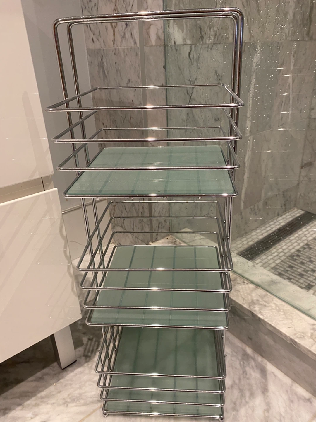 This shelf unit features a chrome frame with 3 levels of tempered glass shelves. It's ideal for storing bathroom essentials or decorative items. The open design provides easy access to everything on the shelves.