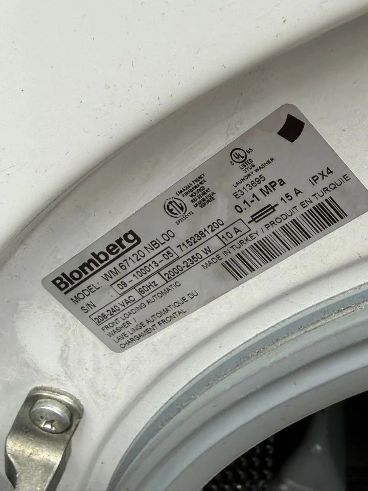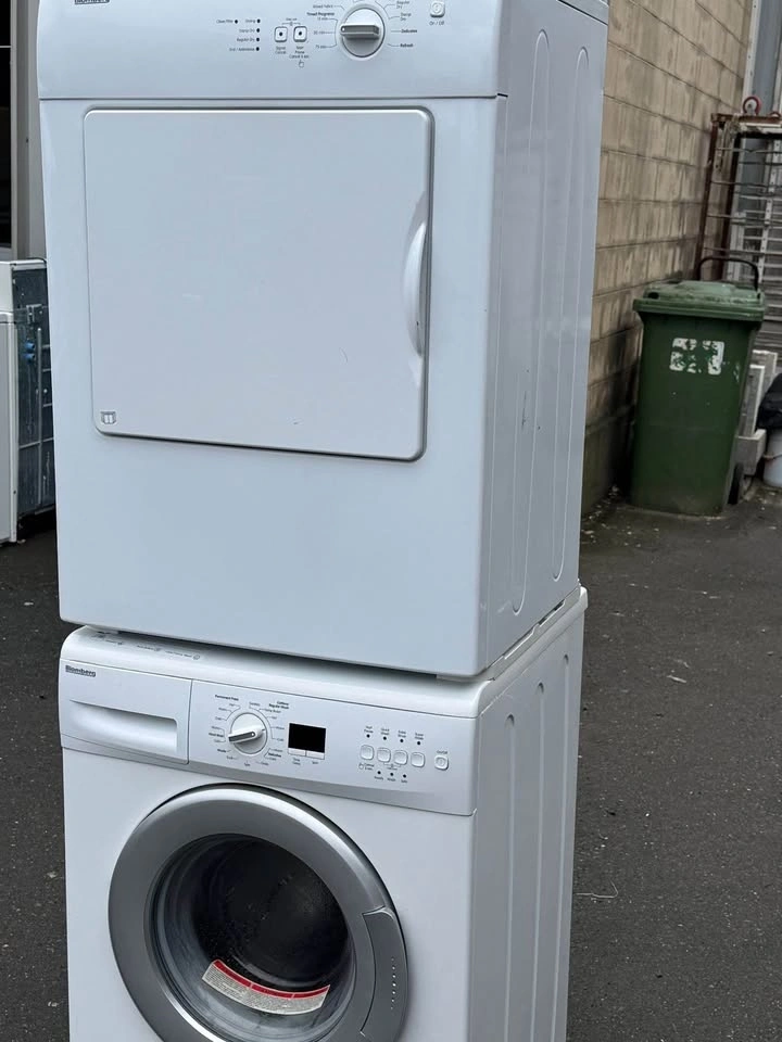 Efficient Blomberg stackable laundry set. This pair has a front load washer (model WM 67120 NBL00) and a tumble dryer (model DV 16540 NBL00). Both units are 208-240 volt. Super convenient for small spaces.