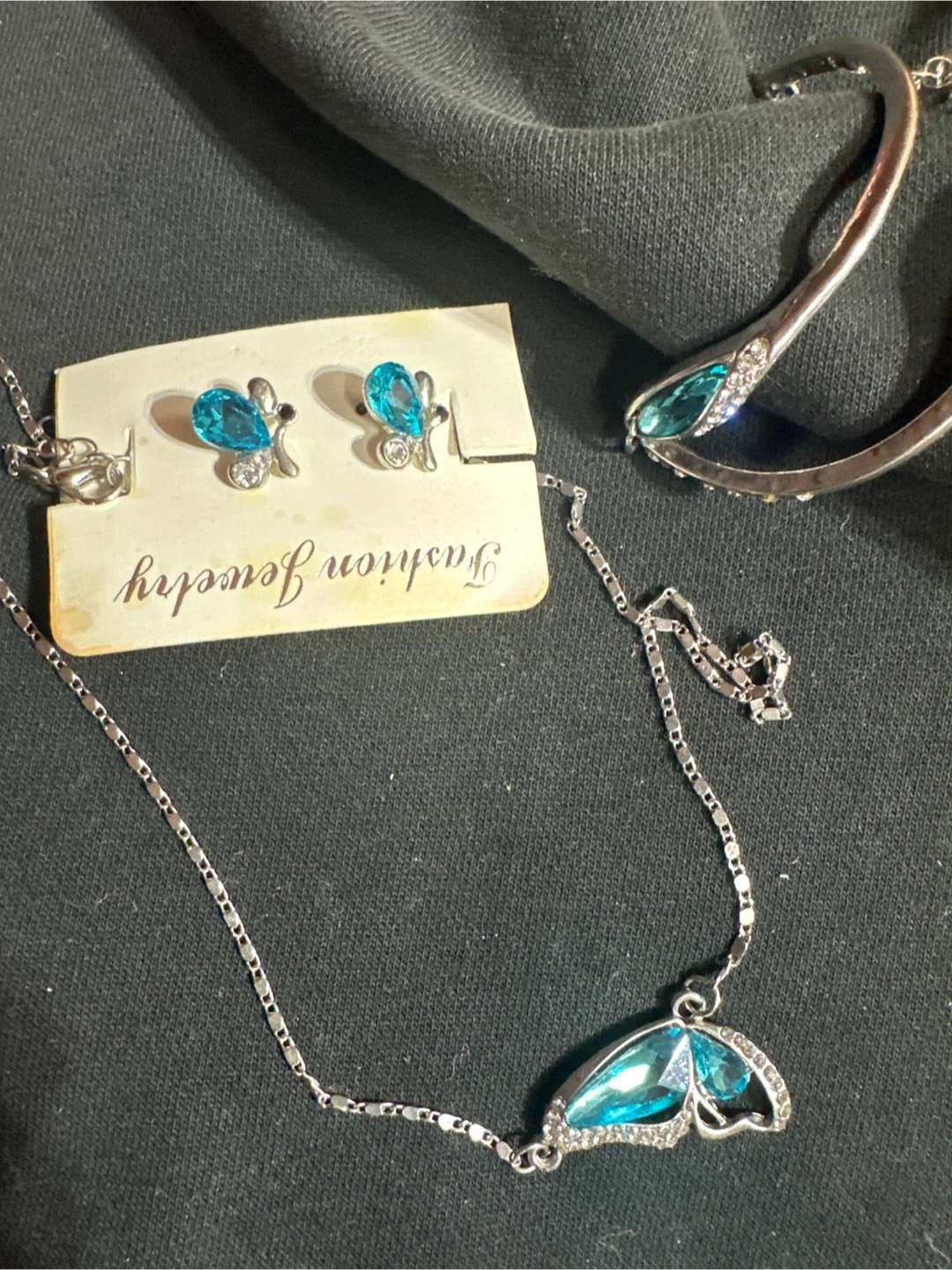 This set includes a silver-toned necklace with a blue crystal butterfly pendant and matching butterfly stud earrings. It's crafted with a delicate chain and sparkling rhinestones around the main blue gems. This jewelry set is a lovely accessory for adding a touch of colour!