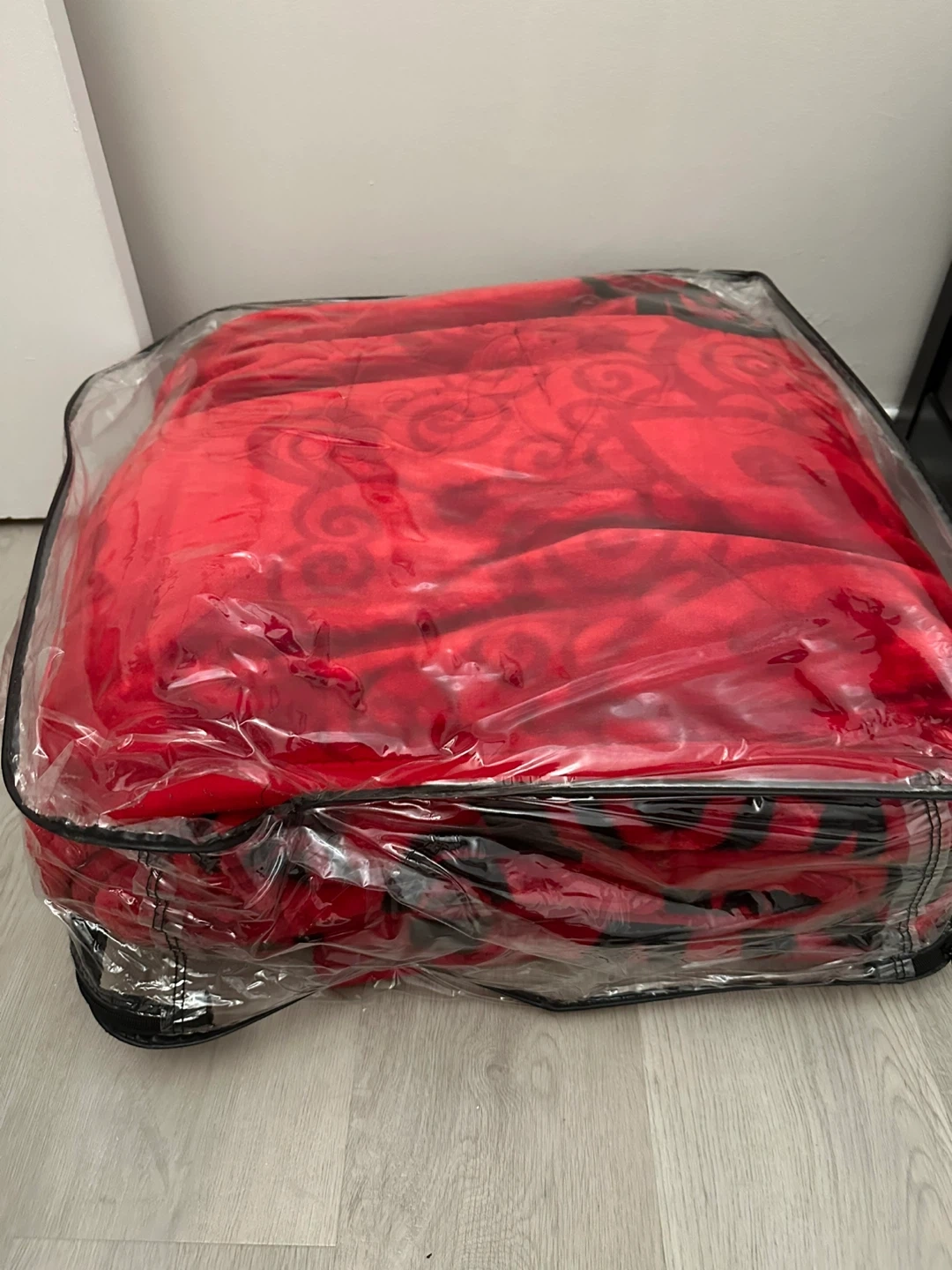 Selling a cozy red blanket with a stylish black pattern. It's still in its original packaging, so it's in perfect condition. This blanket will definitely add a pop of colour and warmth to any room!