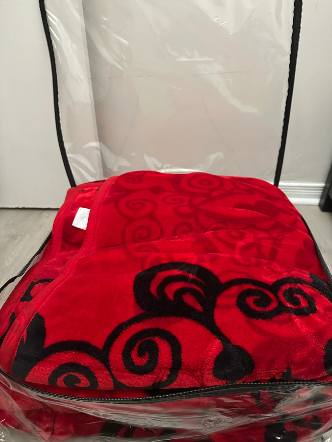 Selling a cozy red blanket with a stylish black pattern. It's still in its original packaging, so it's in perfect condition. This blanket will definitely add a pop of colour and warmth to any room!