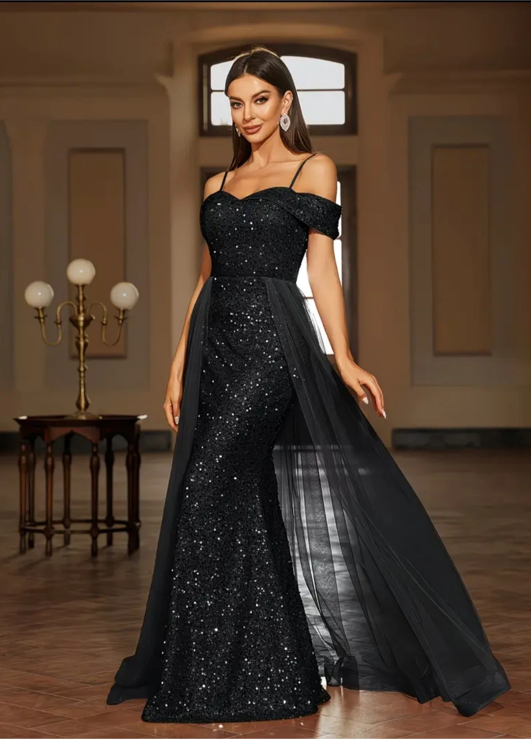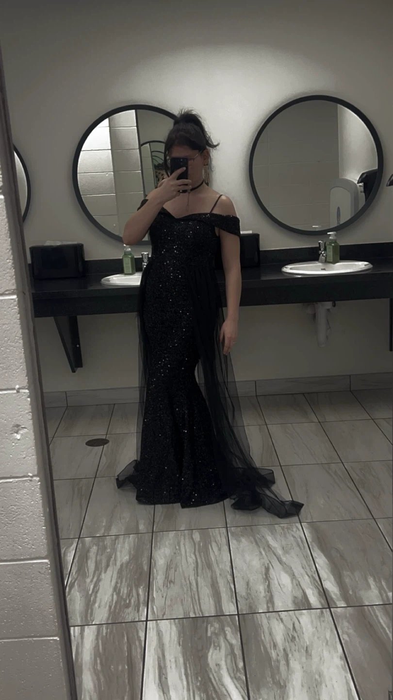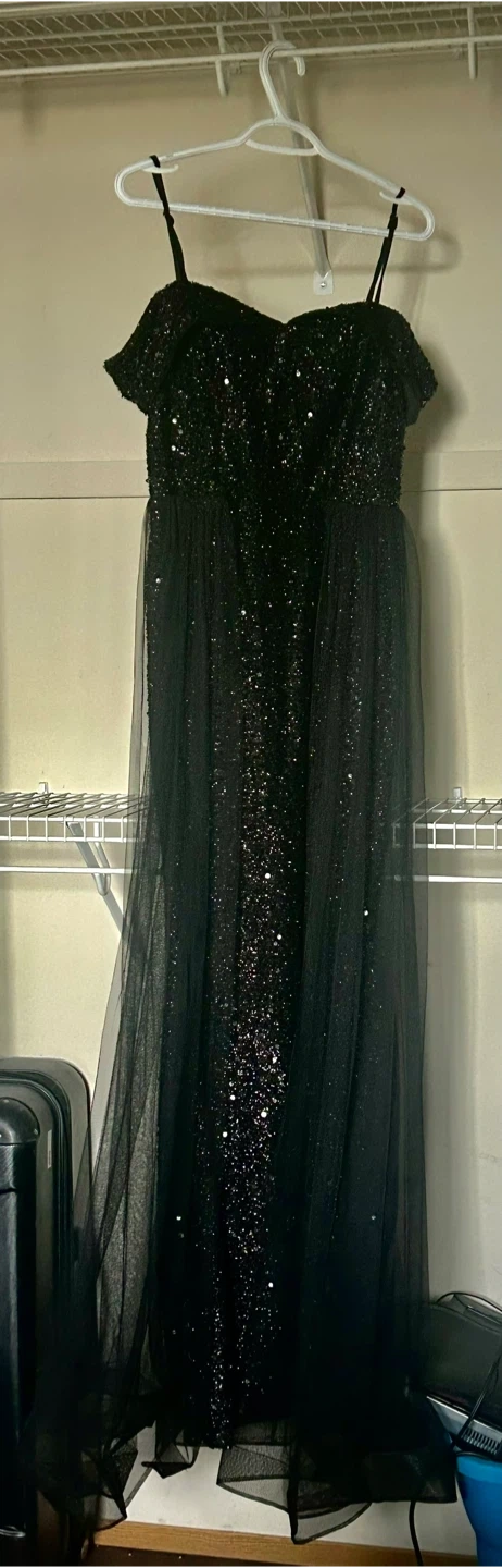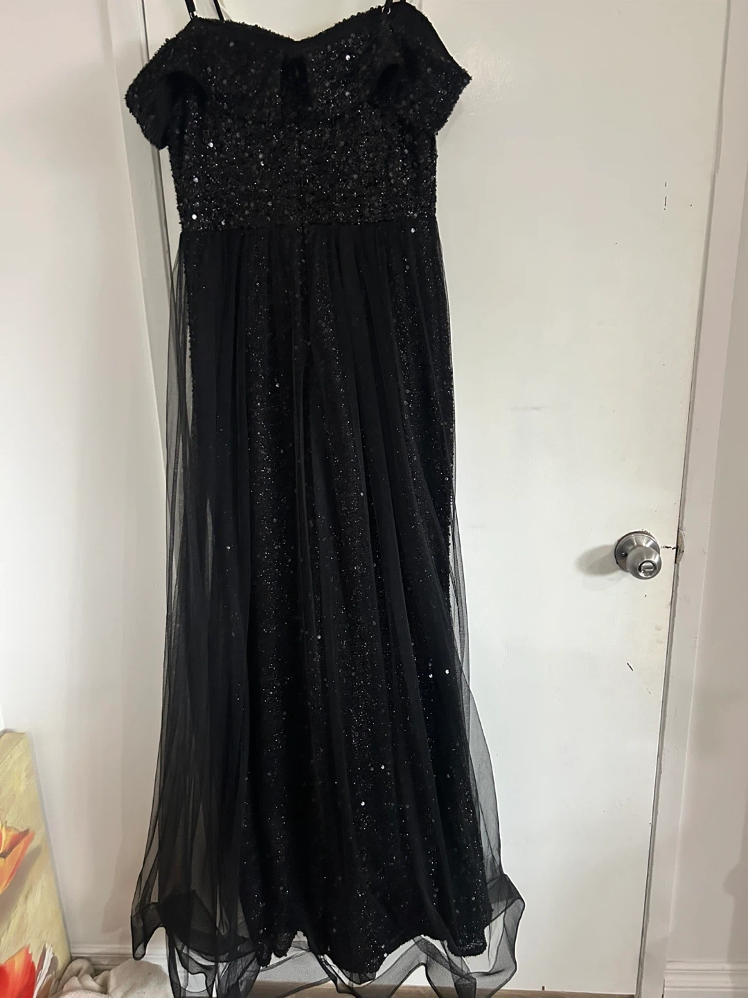Beautiful black sequin gown featuring an off-the-shoulder neckline and a flowing tulle train. The dress has a fitted bodice that flares out into a long, elegant skirt. Worn twice. Small, need gone!