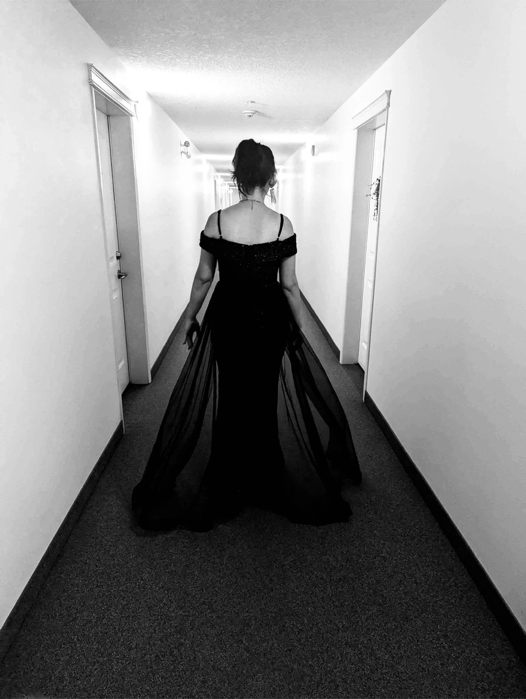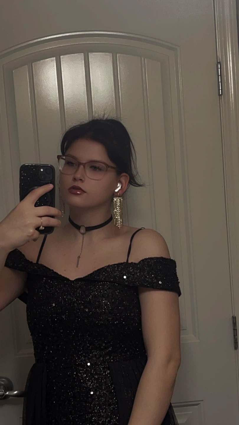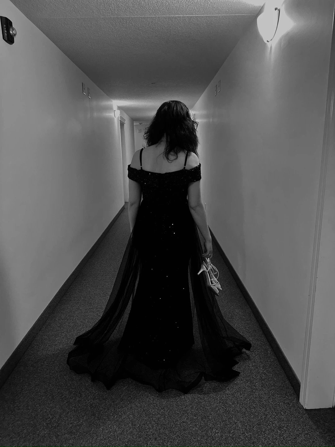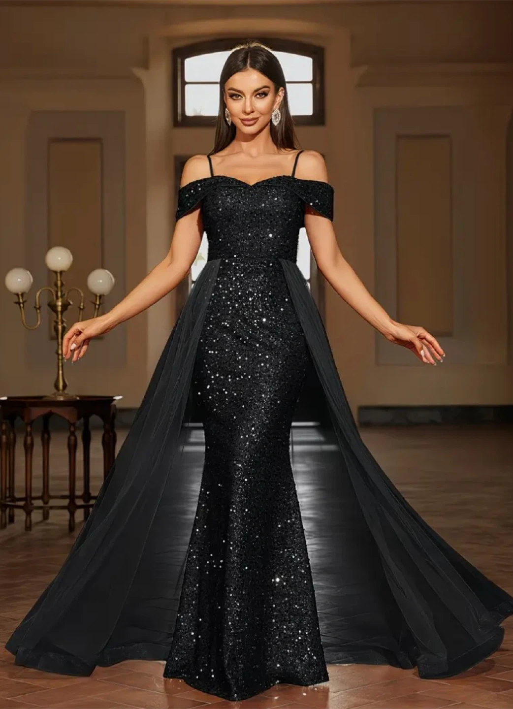 Beautiful black sequin gown featuring an off-the-shoulder neckline and a flowing tulle train. The dress has a fitted bodice that flares out into a long, elegant skirt. Worn twice. Small, need gone!