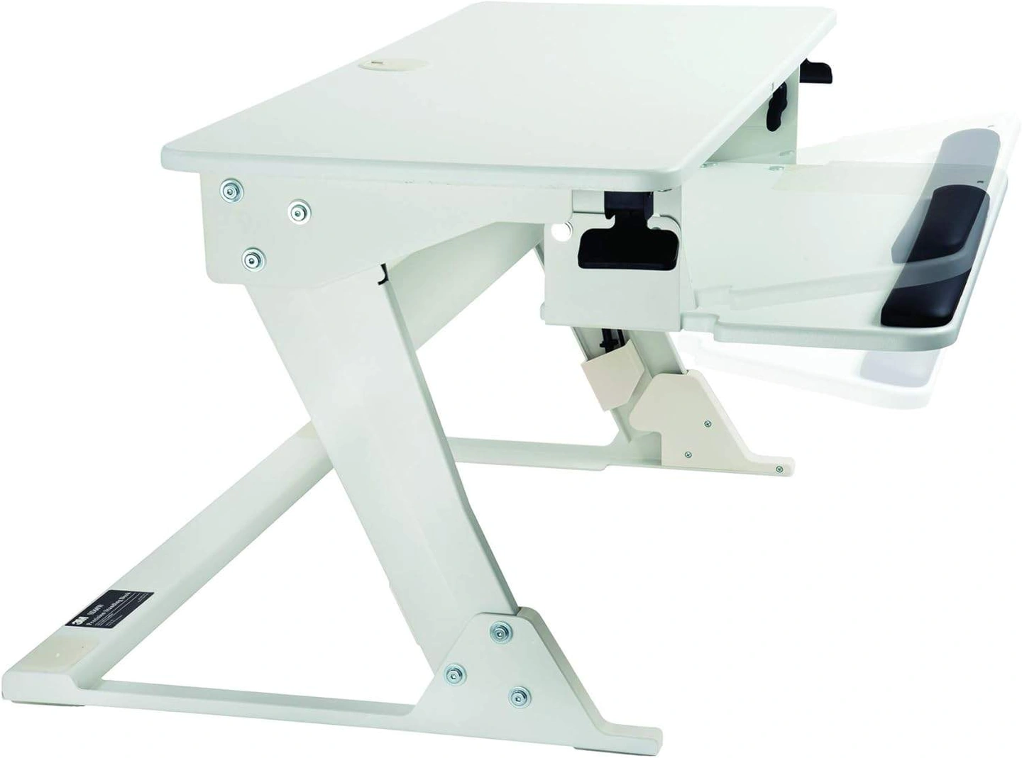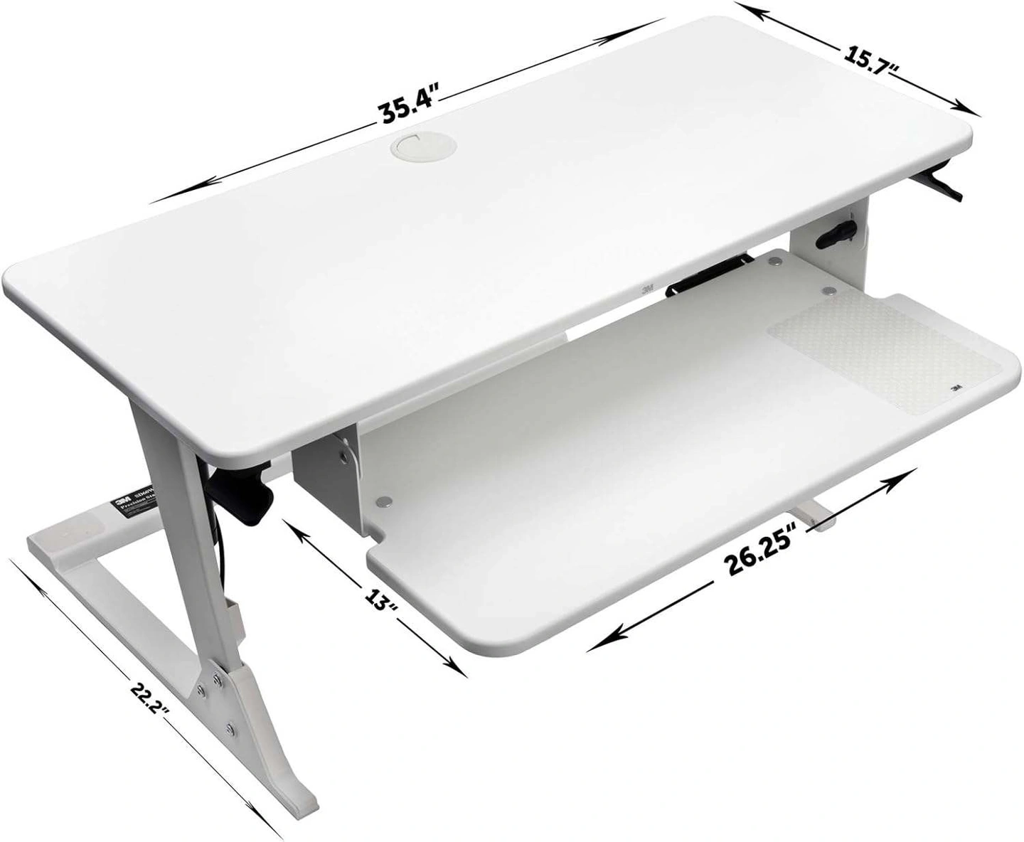 Here's a 3M adjustable standing desk new in box! It's white and features a pull-out keyboard tray. The dimensions are 35.4" x 15.7" for the top surface, and the keyboard tray is 26.25" x 13". Perfect for creating an ergonomic workspace at home or in the office