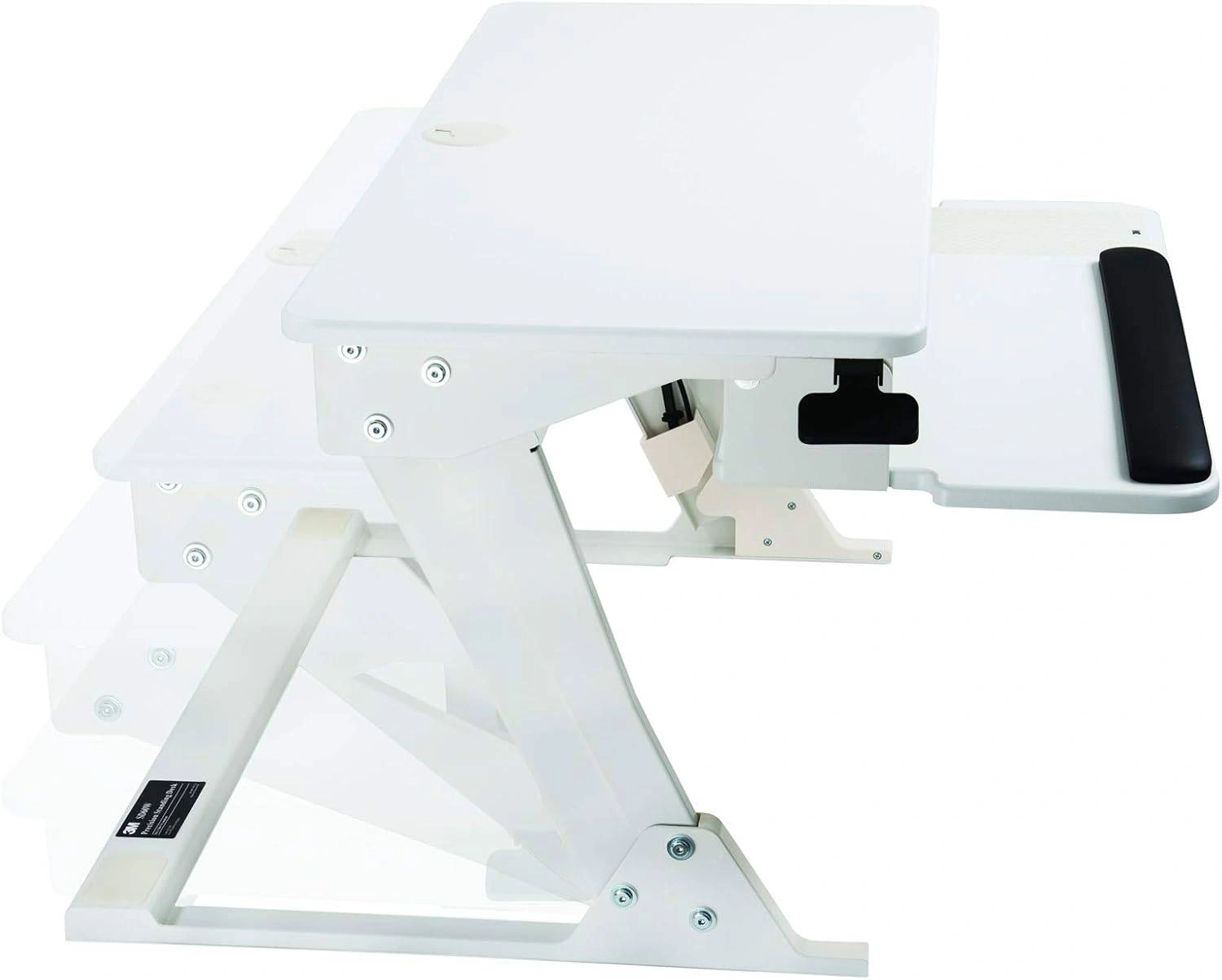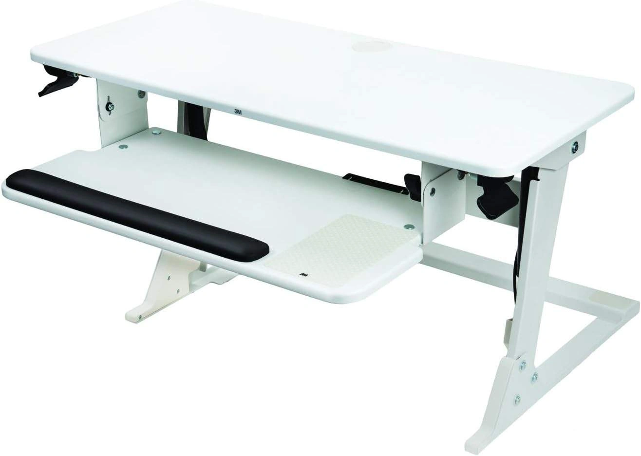 Here's a 3M adjustable standing desk new in box! It's white and features a pull-out keyboard tray. The dimensions are 35.4" x 15.7" for the top surface, and the keyboard tray is 26.25" x 13". Perfect for creating an ergonomic workspace at home or in the office