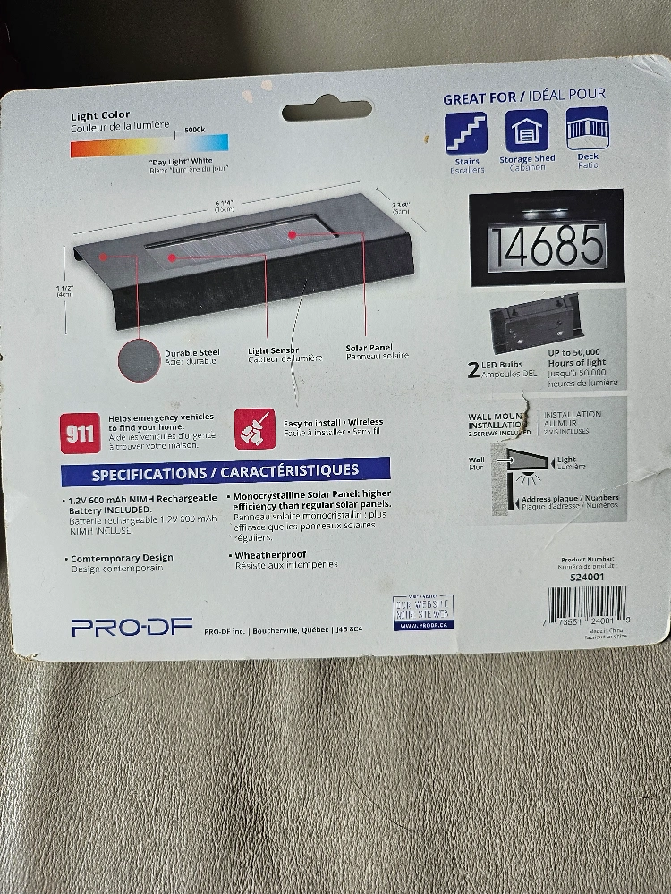 A solar-powered LED address light. Rectangular-shaped, with a black finish. A perfect addition to any home to help you feel safe and secure for address numbers, decks, stairs, etc..