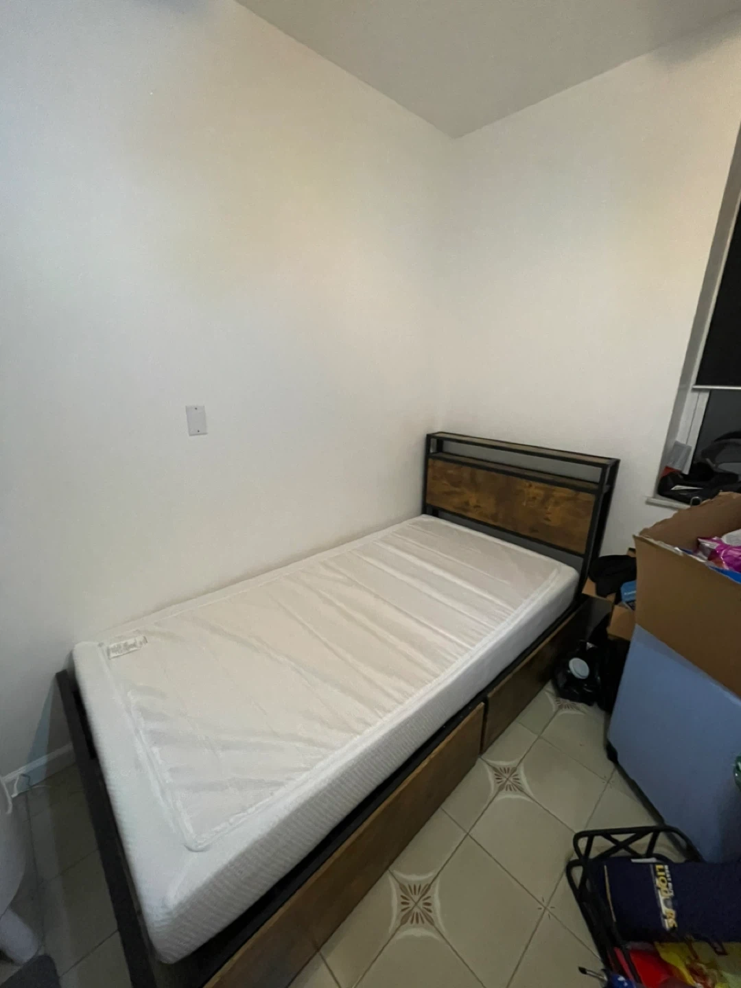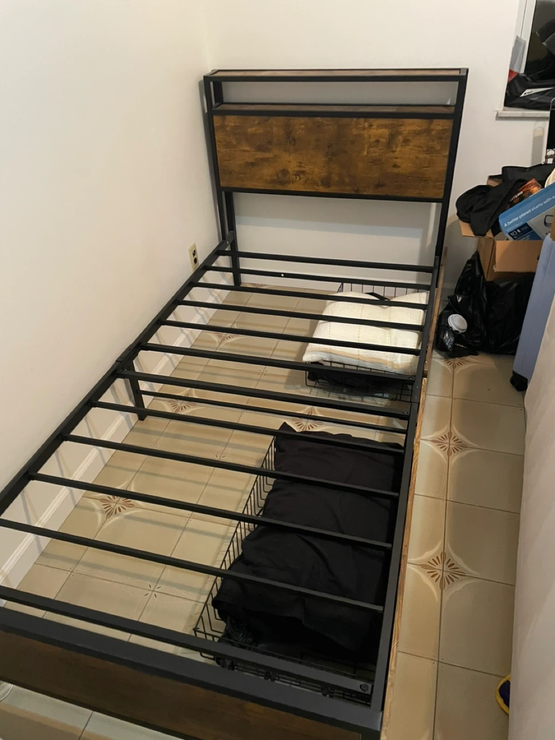 This twin size bed frame features a sturdy metal construction with a rustic wood-look headboard. It includes a mattress and a slat system for support. Storage drawers are built into the base for convenience!