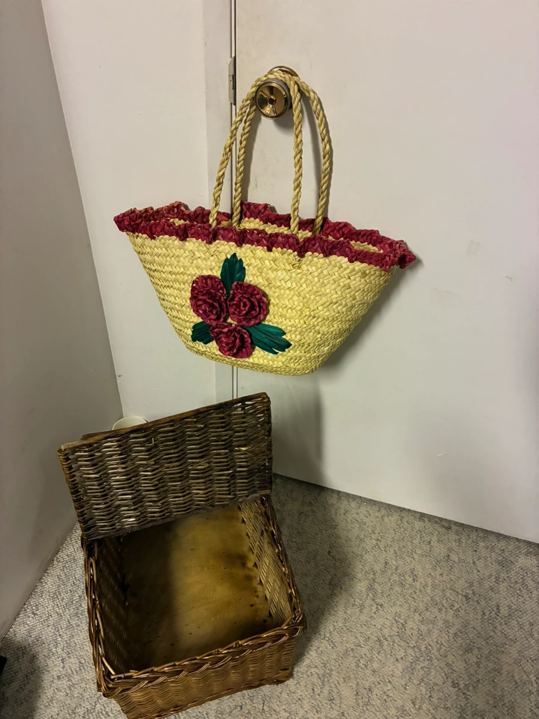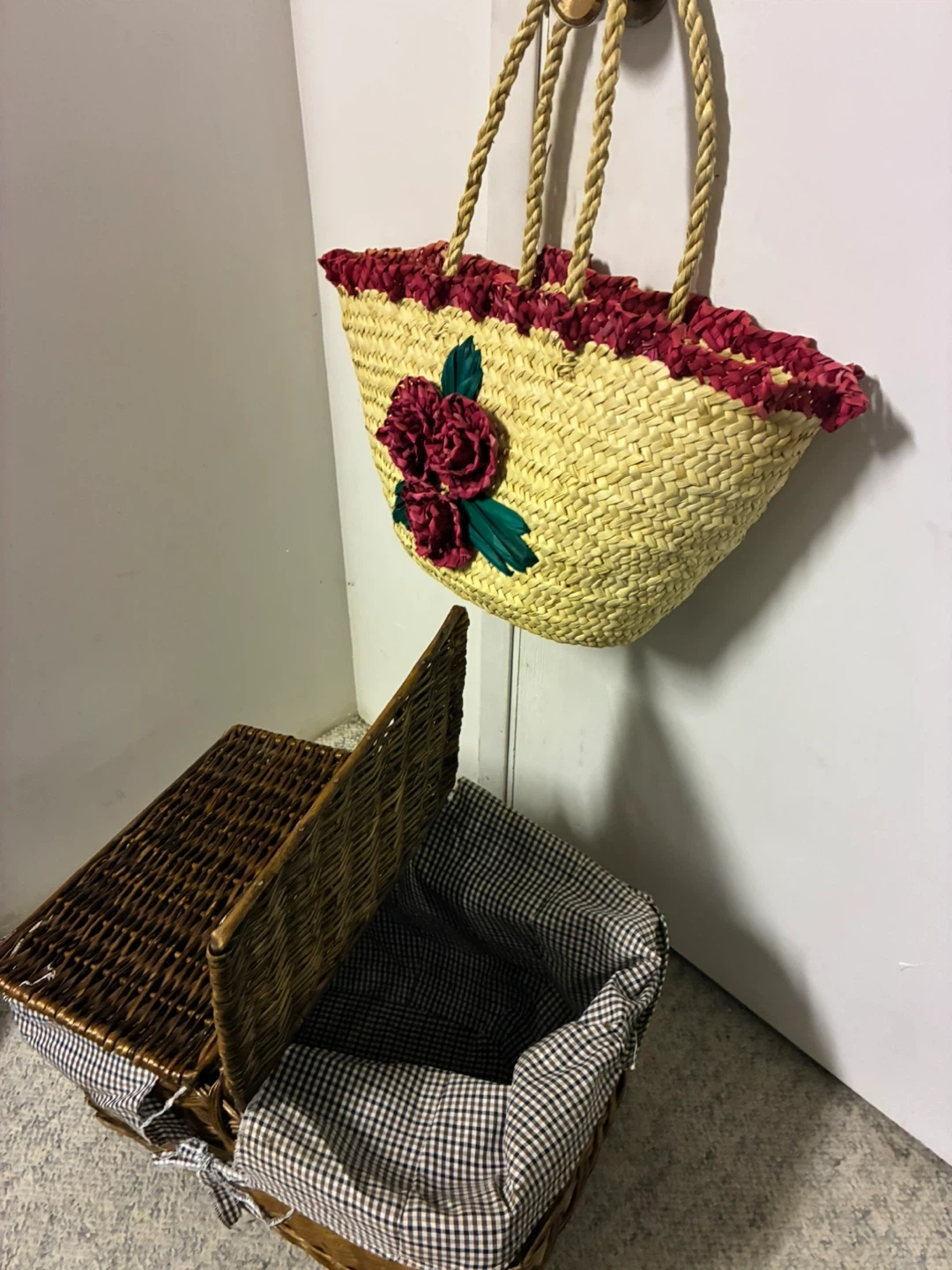 Wicker Picnic Basket and Straw Tote Bag