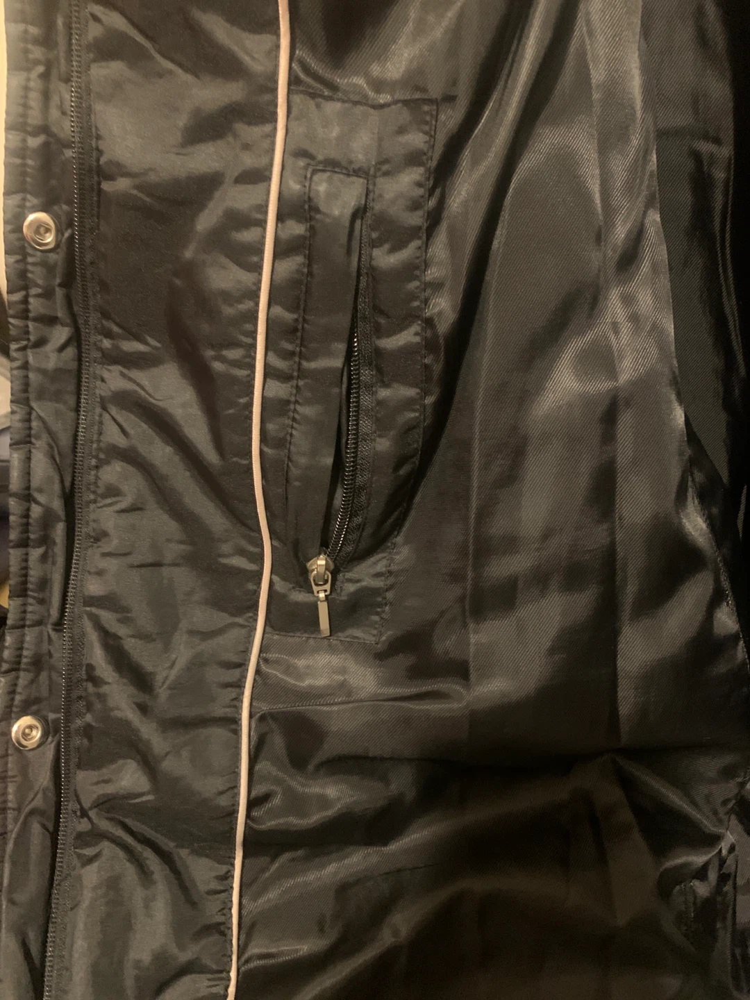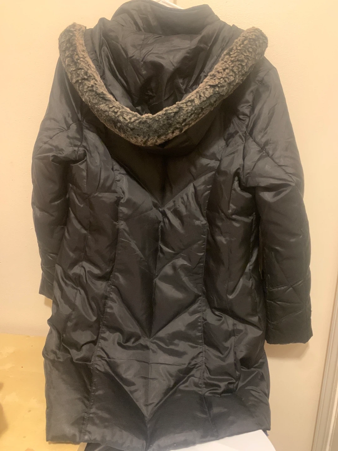 This black down coat is perfect for staying warm. It features a removable hood with faux fur trim and front snap and zipper closure. Two outer pockets and an inner zippered pocket provide storage. Size S.