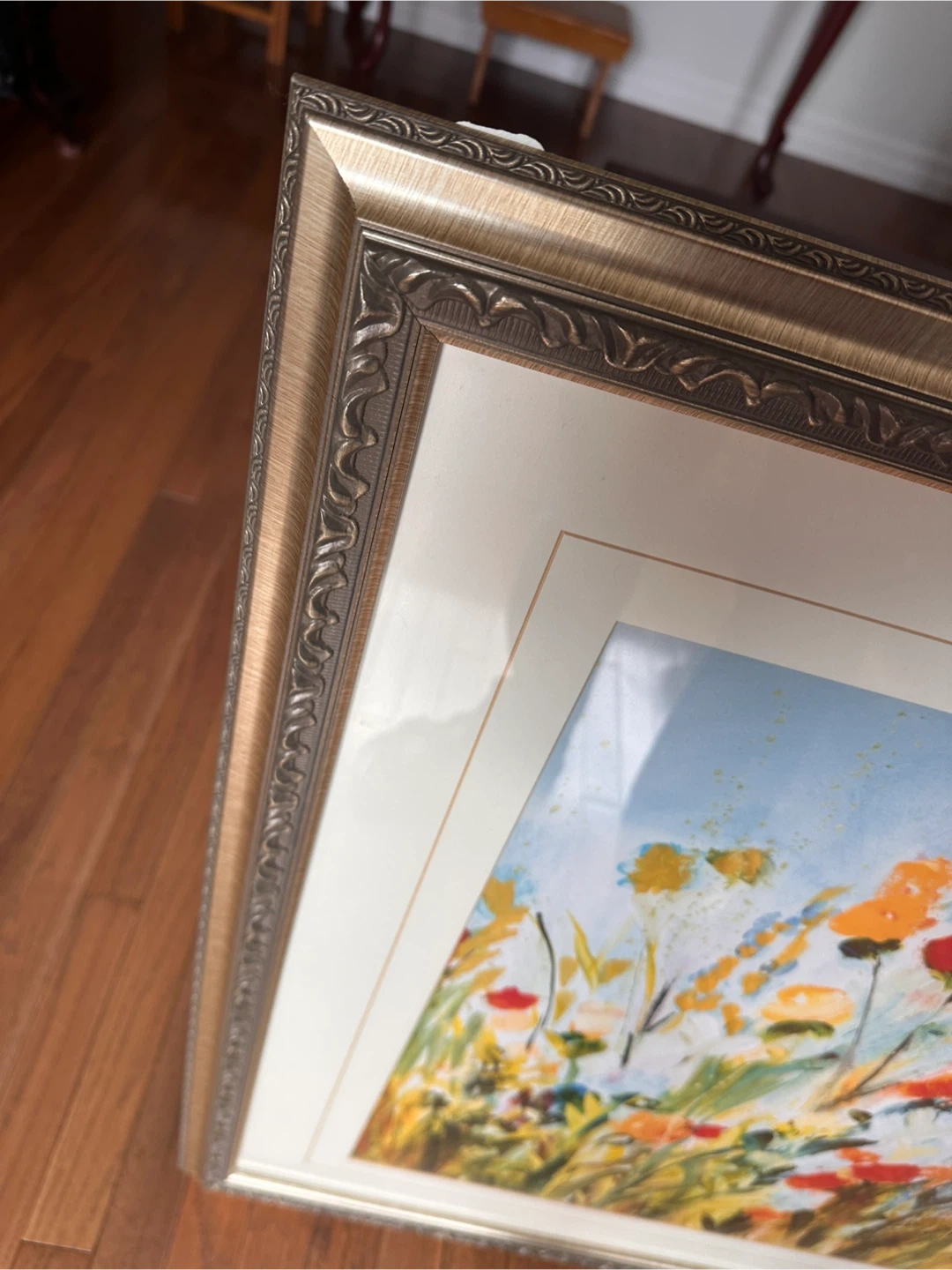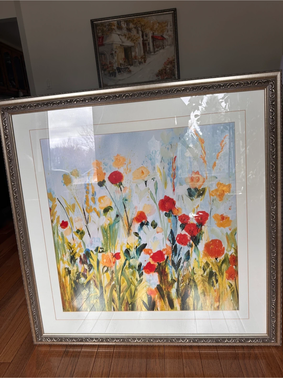 This is a framed art print featuring a vibrant floral design with red and orange blossoms. It's matted and housed in a decorative silver and gold frame. The artwork adds a splash of colour to any room!