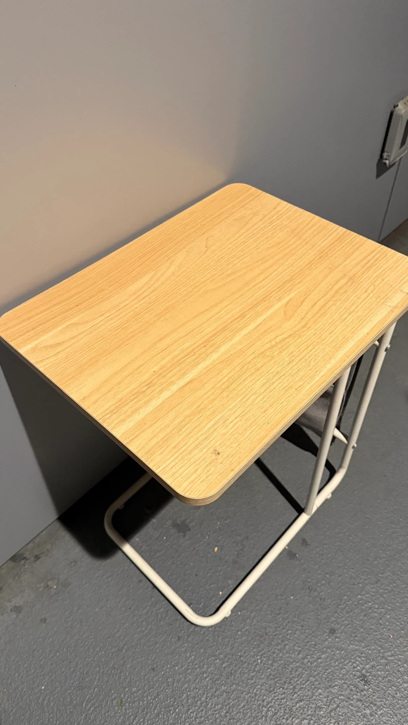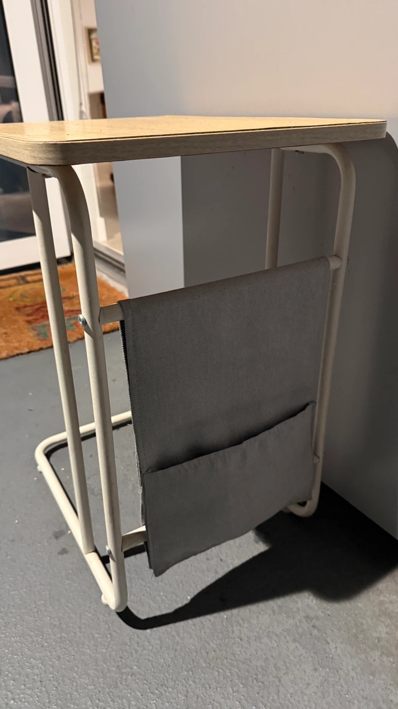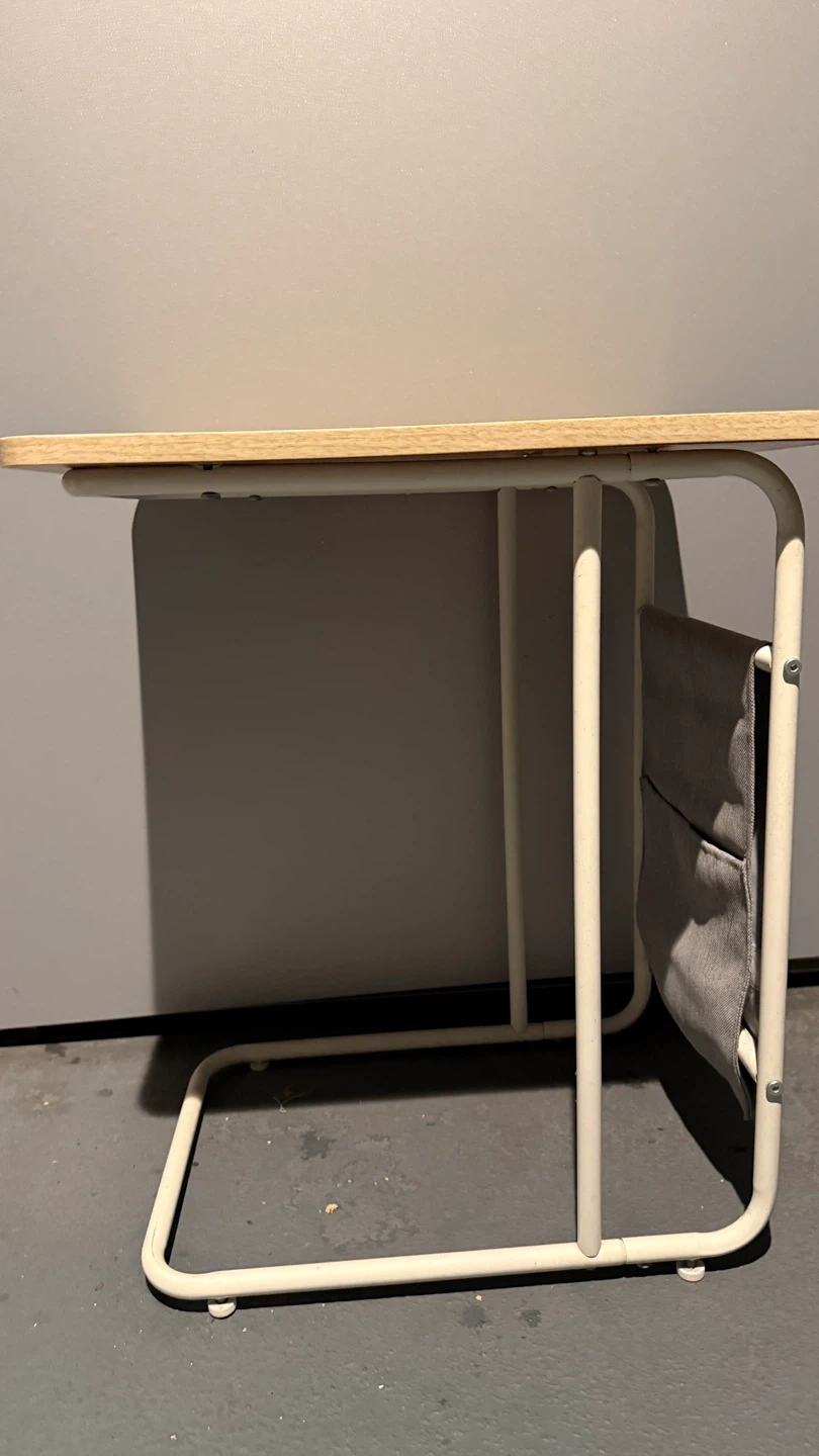 60Selling a handy side table that's perfect for small spaces! It features a built-in magazine holder, so you can keep your favourite reads close by. The table has a light wood-look top and a white metal frame. It's in great shape and ready for a new home