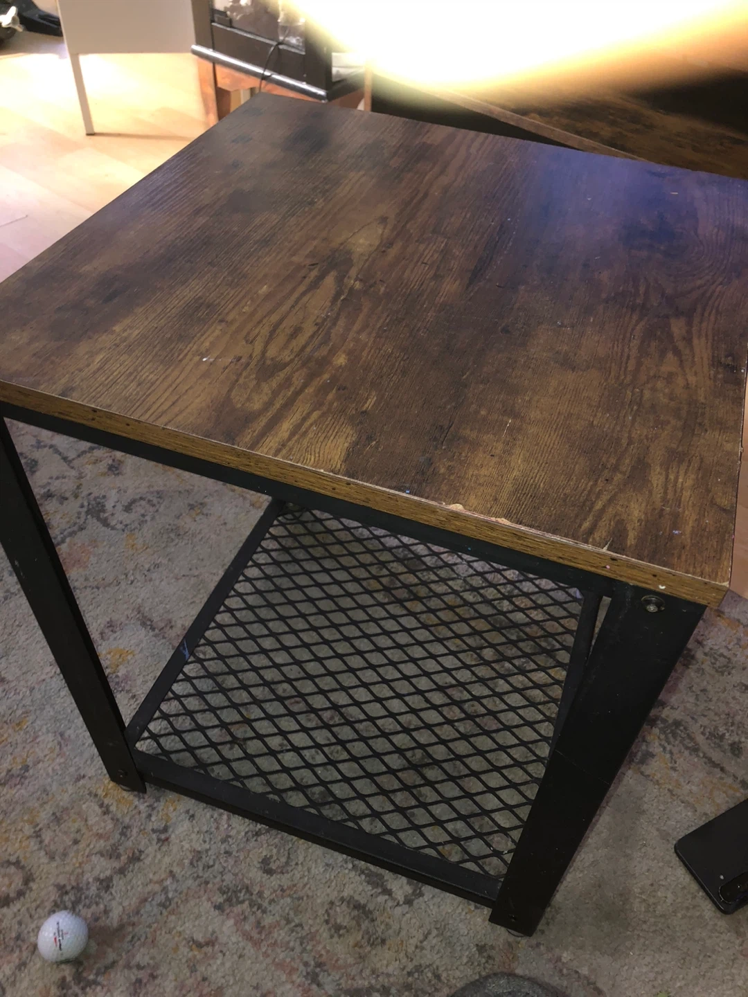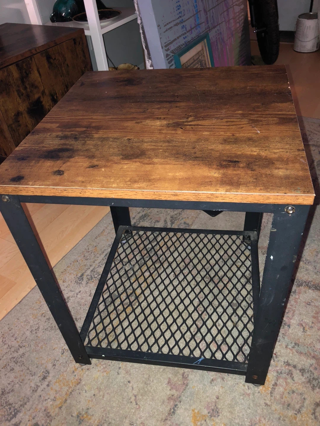 44Selling a side table with a rustic wood-look top and a sturdy metal frame. It's perfect for adding a touch of industrial style to any room. The table includes a handy metal mesh shelf for extra storage. It's in great shape!