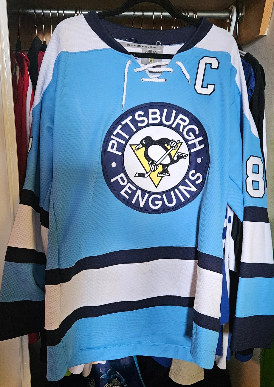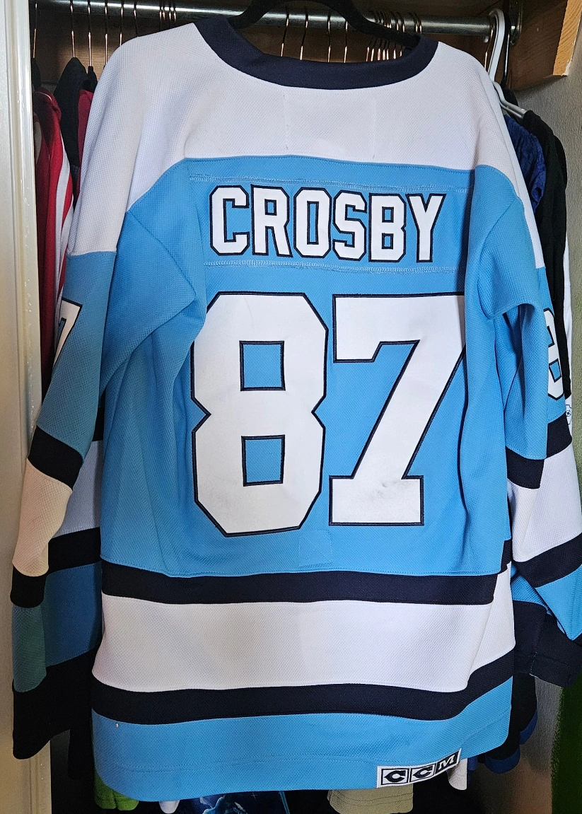 Selling a Sidney Crosby #87 Pittsburgh Penguins hockey jersey. It's a CCM brand jersey in light blue. Winter Classic Men's jersey. Size 48. Pick up Mississauga. Tomken and Bloor. $70 or best offer