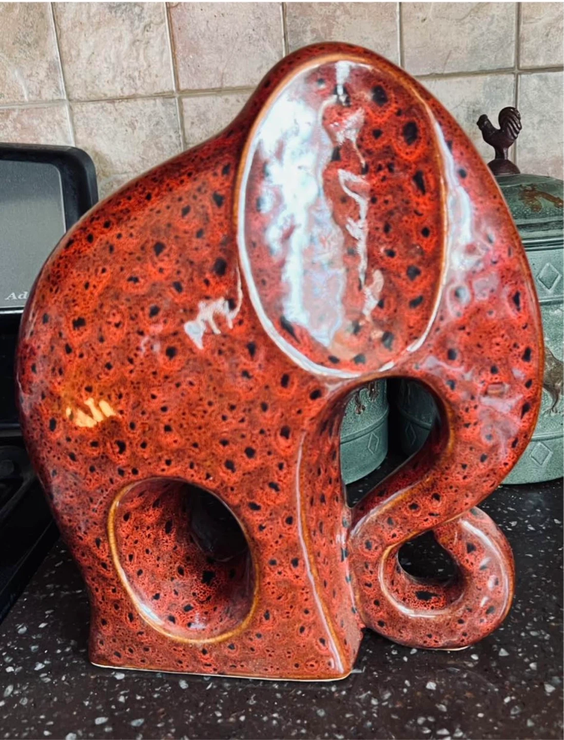 This beautiful elephant sculpture features a mottled red-brick and black glaze. It measures approximately 8 3/4 inches tall and is designed as a decorative home accent. Weighs about 5lbs.