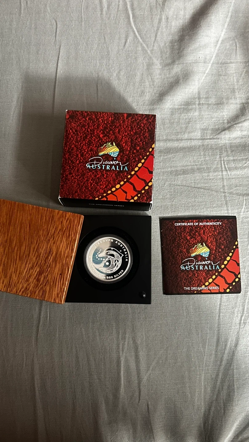 This is a 2009 Discover Australia coin featuring a dolphin. It contains 1 oz of 99.9% pure silver. Includes a certificate of authenticity and a wooden presentation box.