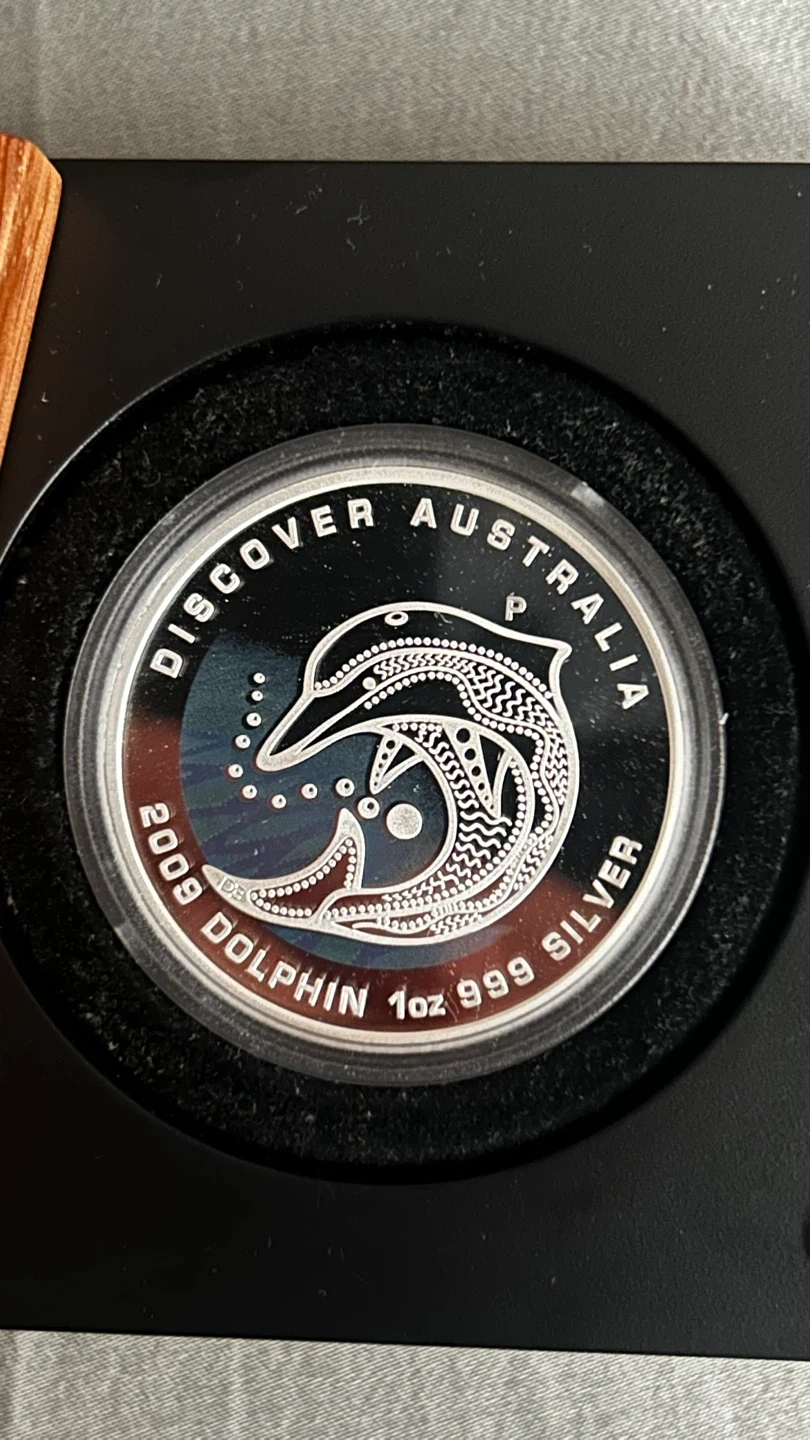 This is a 2009 Discover Australia coin featuring a dolphin. It contains 1 oz of 99.9% pure silver. Includes a certificate of authenticity and a wooden presentation box.
