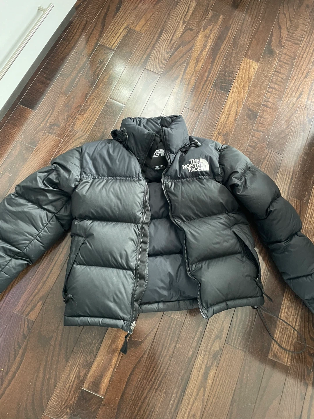 This is a black puffer jacket from The North Face. It's filled with down for warmth. The jacket has a full zip closure and a stand-up collar. This jacket is great for cold weather activities.