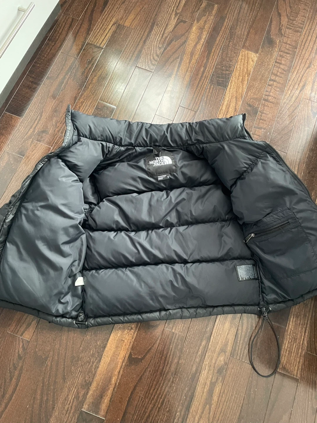 This is a black puffer jacket from The North Face. It's filled with down for warmth. The jacket has a full zip closure and a stand-up collar. This jacket is great for cold weather activities.