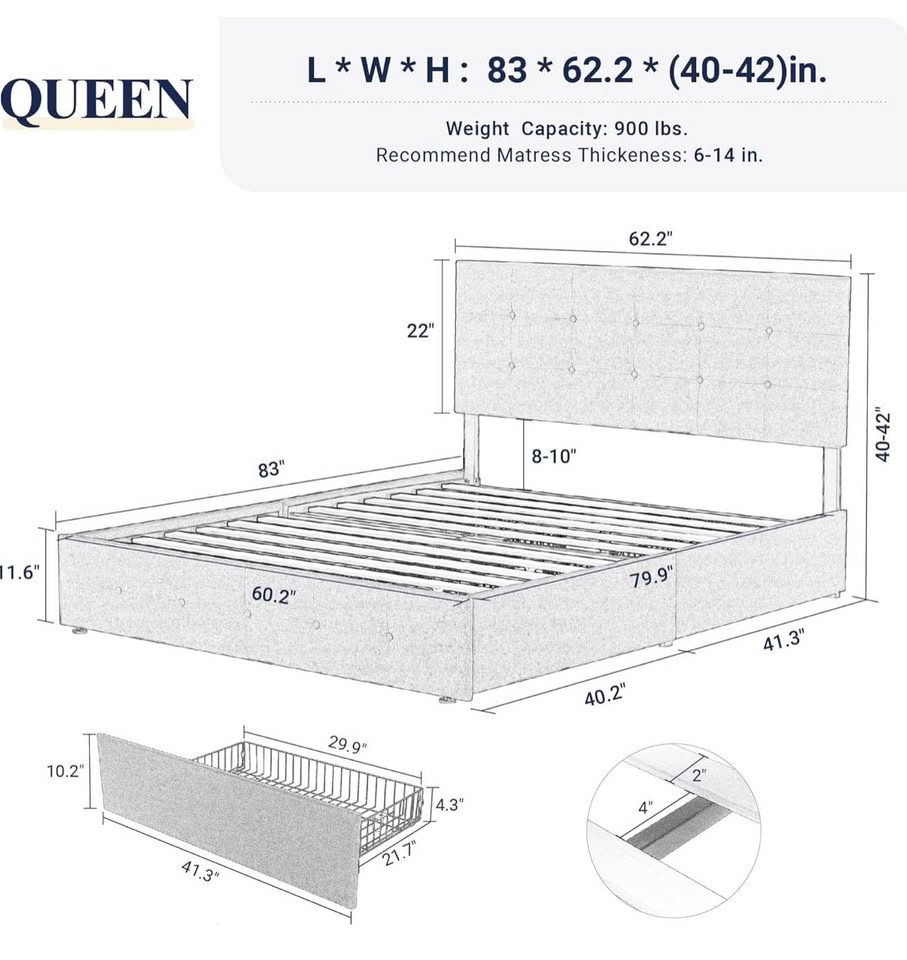 Allewie Upholstered Queen Size Platform Bed Frame with 4 Storage Drawers and Adjustable Headboard, Square Stitched Button Tufted, Wooden Slats Support, No Box Spring Needed, Light Grey. Pick up available.