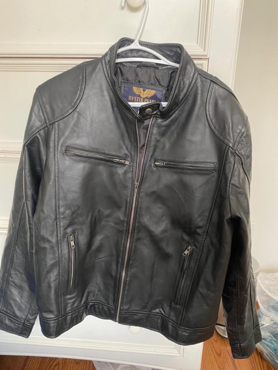 A black leather jacket. Features a stand-up collar and a zipper closure. The jacket has multiple pockets. The back of the jacket is plain. Genuine western style jacket bought from the original owner from Calgary-AB