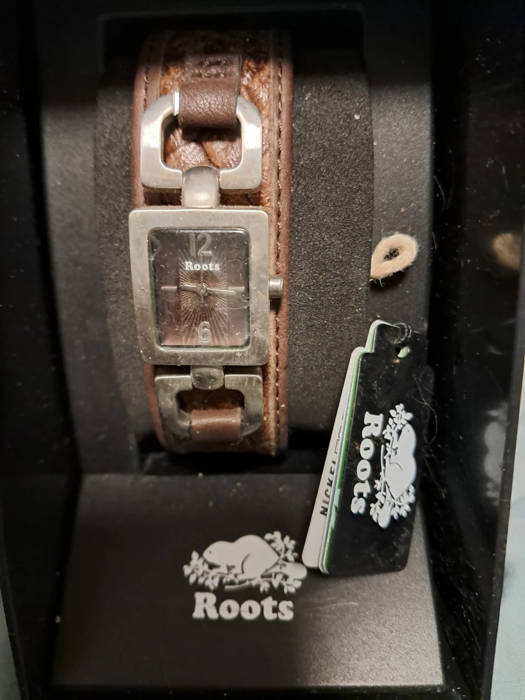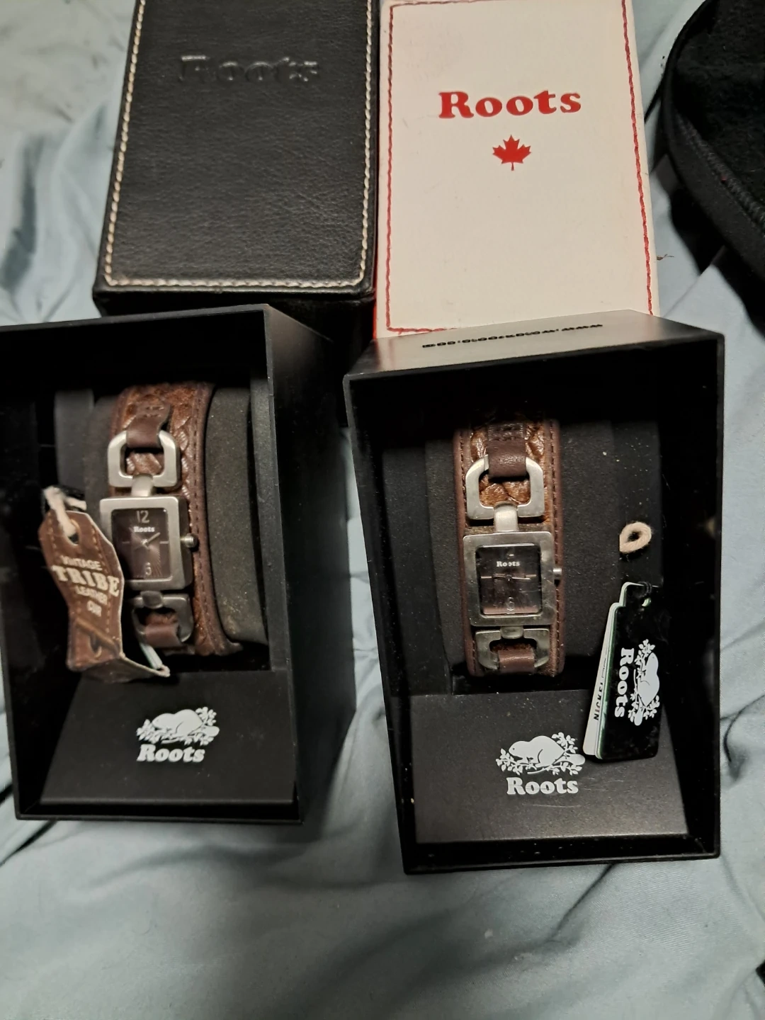 Two Roots women's leather cuff watches. Features a square face with a brown leather band. Both come in their original boxes with tags. These watches are a stylish accessory for everyday wear.