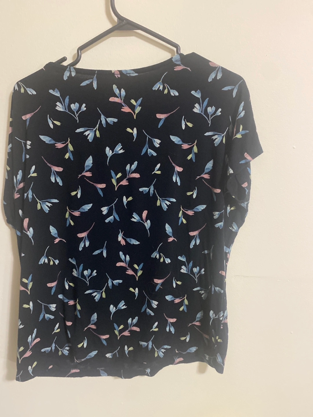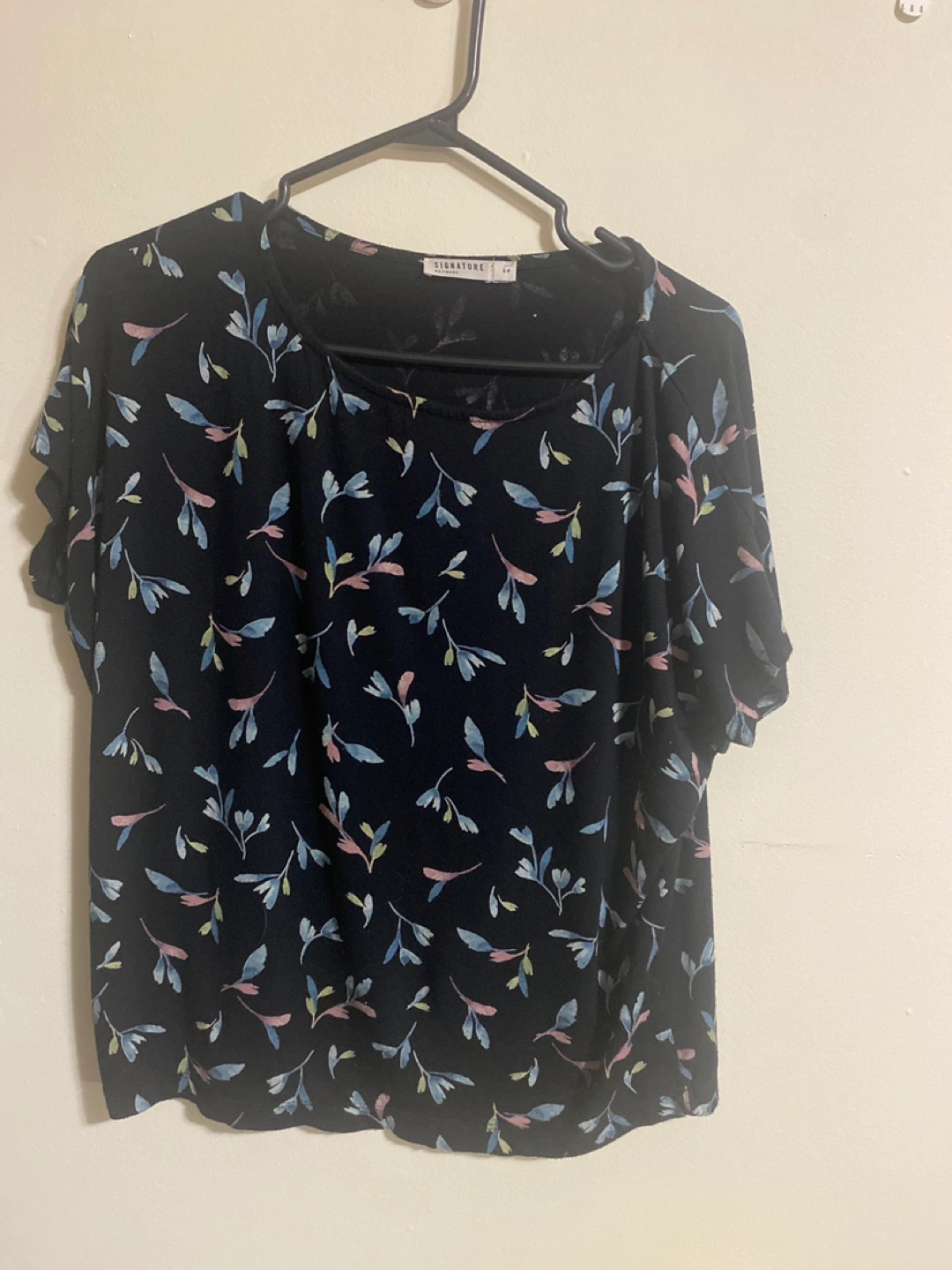 This is a Signature brand t-shirt in size small. It's a black t-shirt with a floral pattern.
