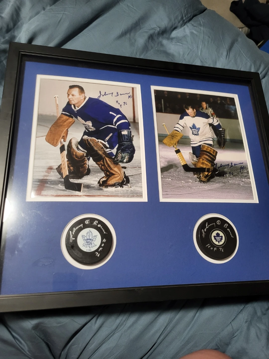 65Selling a framed piece of Johnny Bower memorabilia. It includes photos of him as a Toronto Maple Leafs goalie and two pucks with his signature and HOF 76 designation. A great piece for any Leafs fan!
