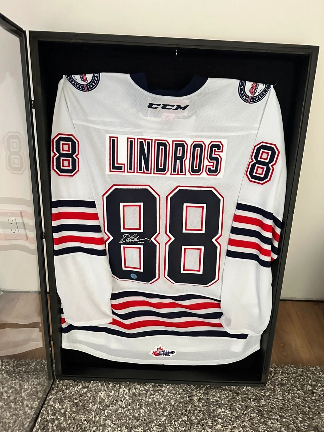 Authenticated signature. OHL Oshawa Generals jersey. Box is homemade with plexiglass door
