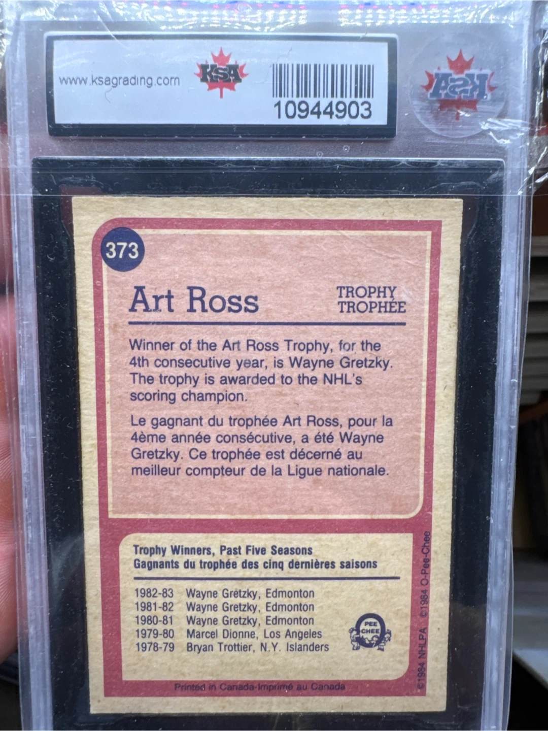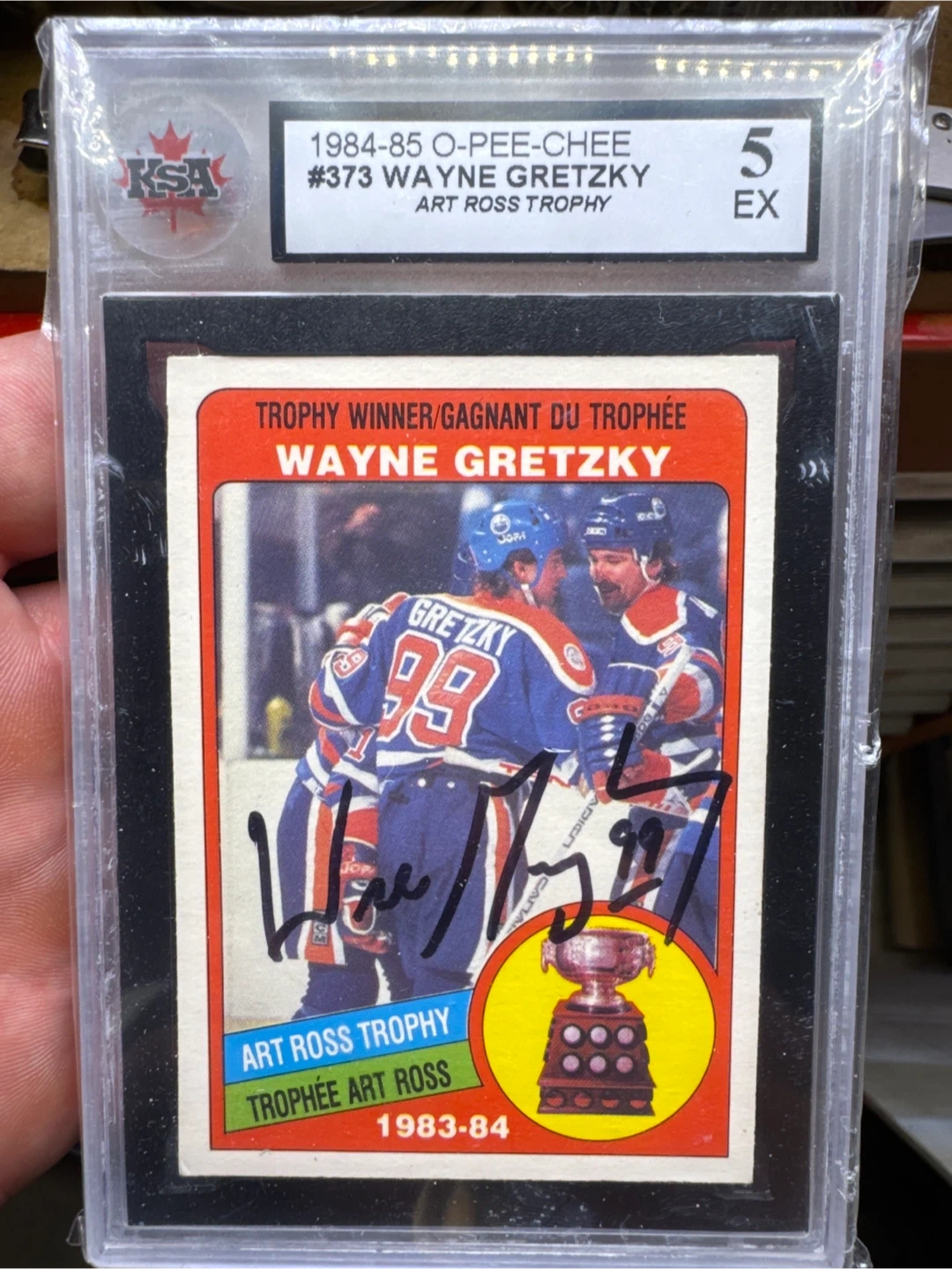 Selling a signed Wayne Gretzky 1984-85 O-Pee-Chee #373 hockey card. It's an Art Ross Trophy card from the 1983-84 season. The card is graded as EX (Excellent) by KSA. A great addition to any hockey card collection!