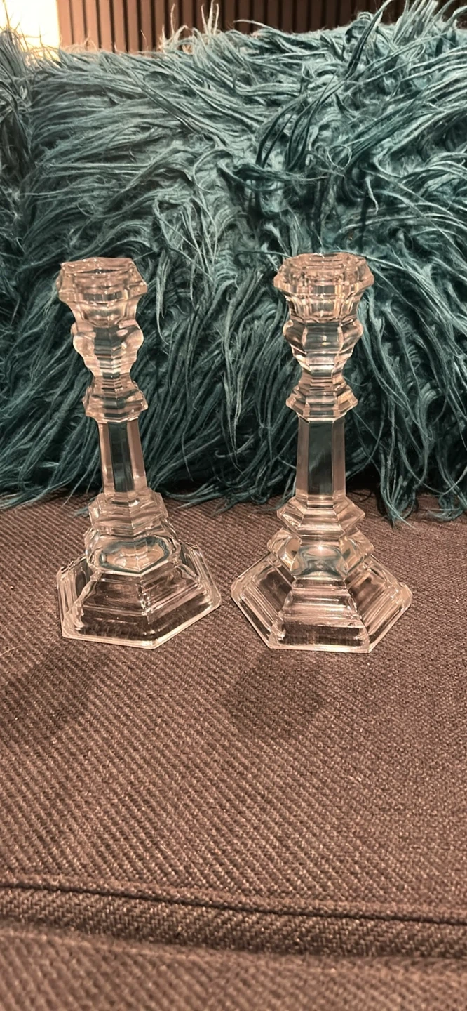 A set of two clear glass candlesticks. These decorative pieces add a touch of elegance to any table setting. They're perfect for holding taper candles.