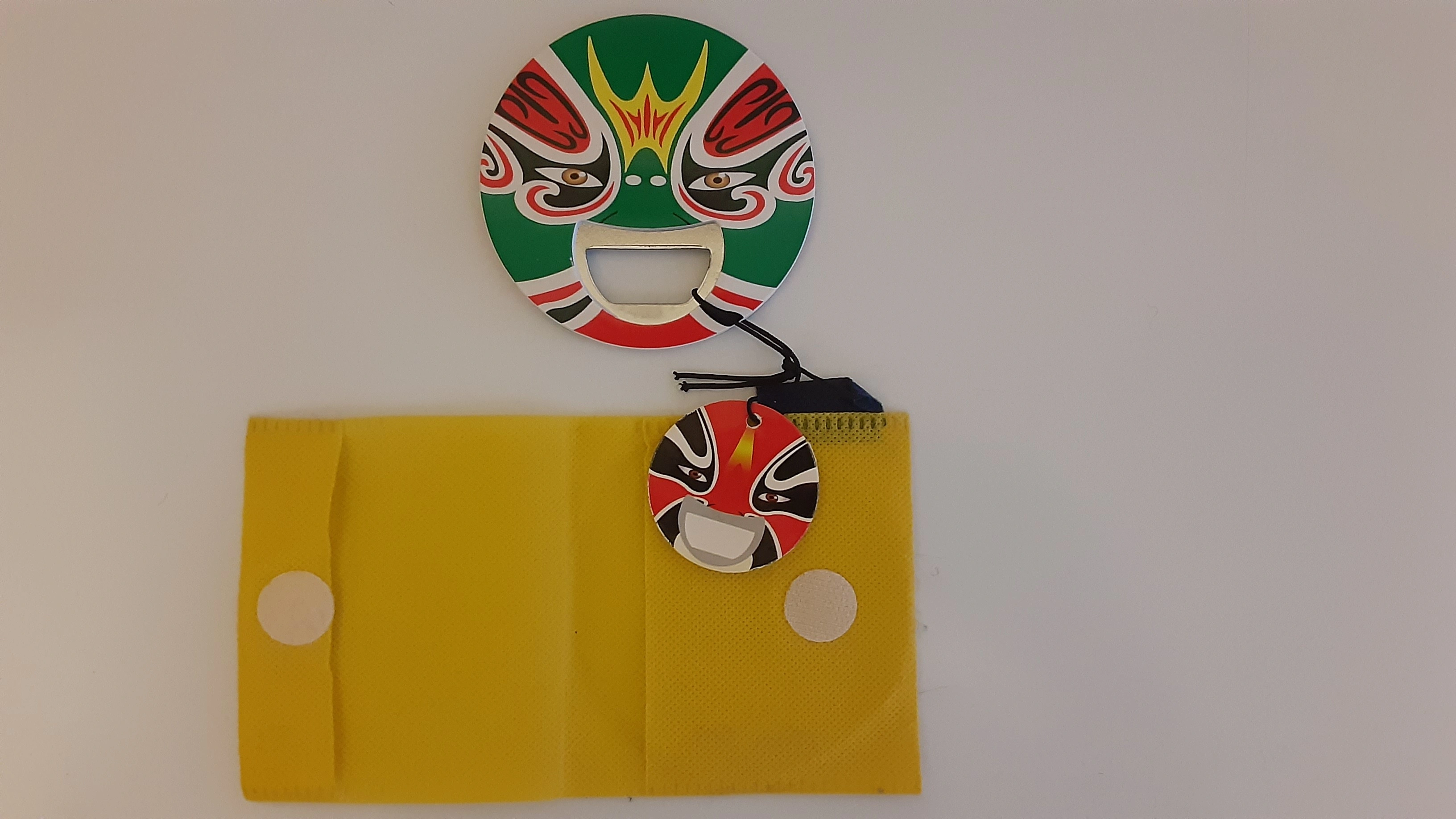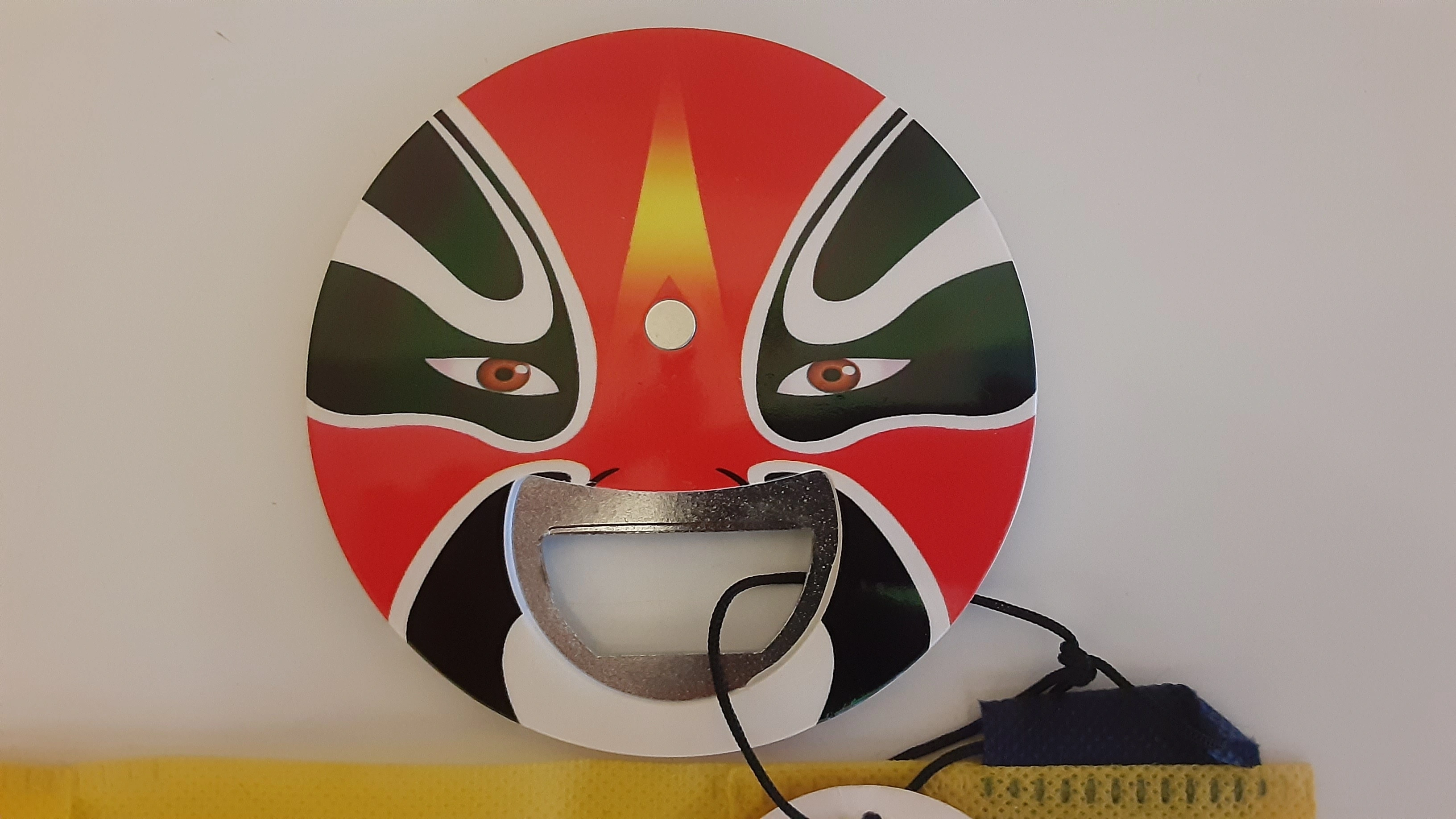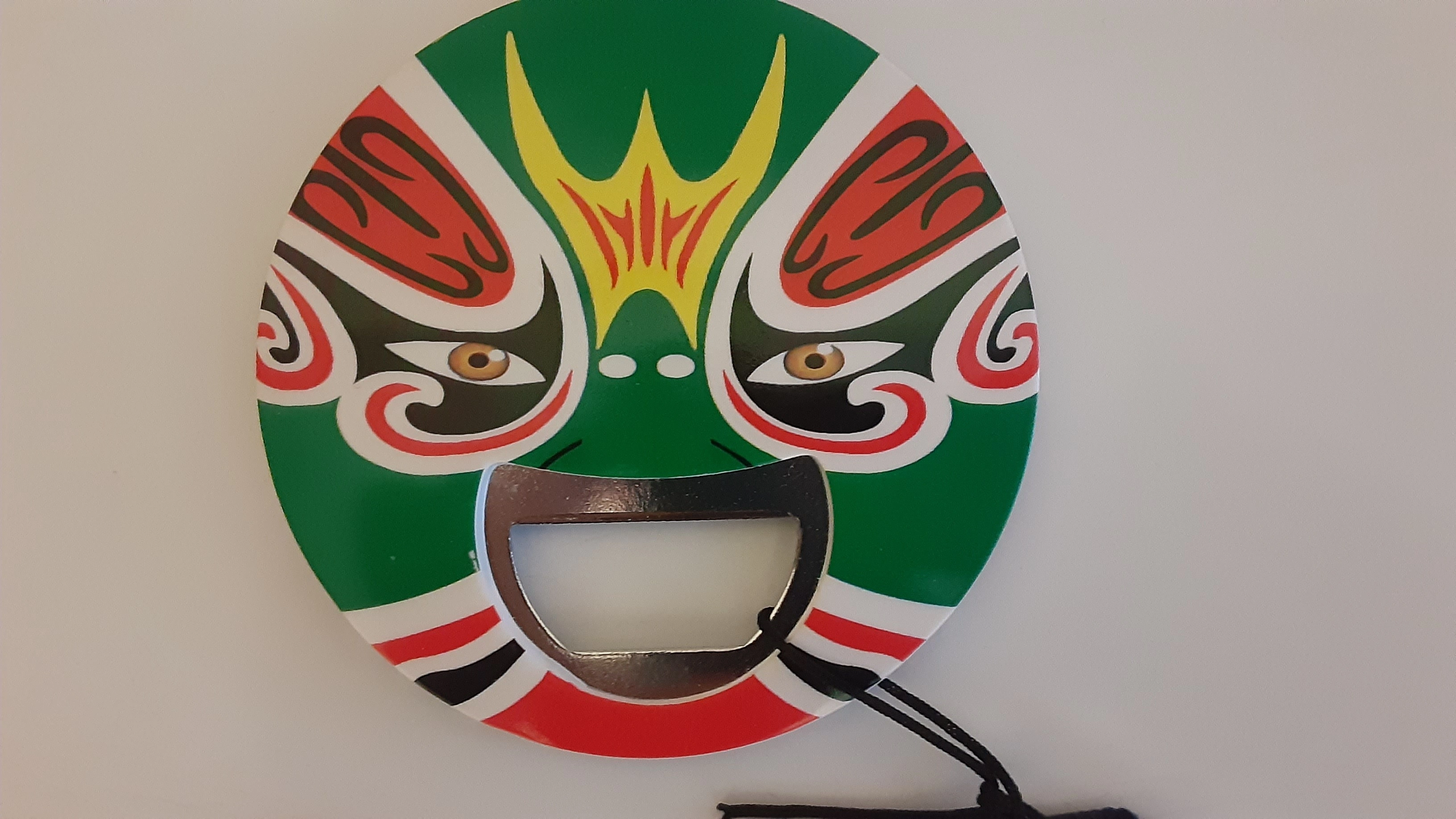 Fun, bright colours, and well-designed, this two-sided Kabuki warrior is up to the task of opening your favourite drink bottles! Add a little samurai style to your next sake party! ~4” wide.